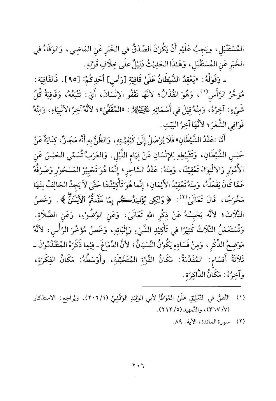 أما "عقد الشيطان" فلا يوصل إلى كيفيته، والظن به أنه مجاز، كناية عن حبس الشيطان، وتثبيطه للإنسان عن قيام الليل. والعرب تسمي الحبس عن الأمور والالتواء تعقيداً، ومنه: عقد الساحر؛ إنما هو تحيير المسحور وصرفه عما كان يفعله، ومنه تعقيد الأيمان؛ إنما هو تأكيدها حتى لا يجد الحالف منها مخرجاً، قال تعالى: {وَلَكِنْ يُؤَاخِذُكُمْ بِمَا عَقَّدْتُمْ الأَيْمَانَ}. وخص الثلاث؛ لأنه يحبسه عن ذكر الله تعالى، وعن الوضوء، وعن الصلاة. وتستعمل الثلاث كثيراً في تأكيد الشيء وإثباته، وخص مؤخر الرأس، لأنه موضع الذكر، ومن فساده يكون النسيان؛ لأن الدماغ- فيما ذكره المتقدمون- ثلاثة أقسام: المقدمة: مكان القوة المتخيلة، وأوسطه: مكان الفكرة، وآخره: مكان الذاكرة.
