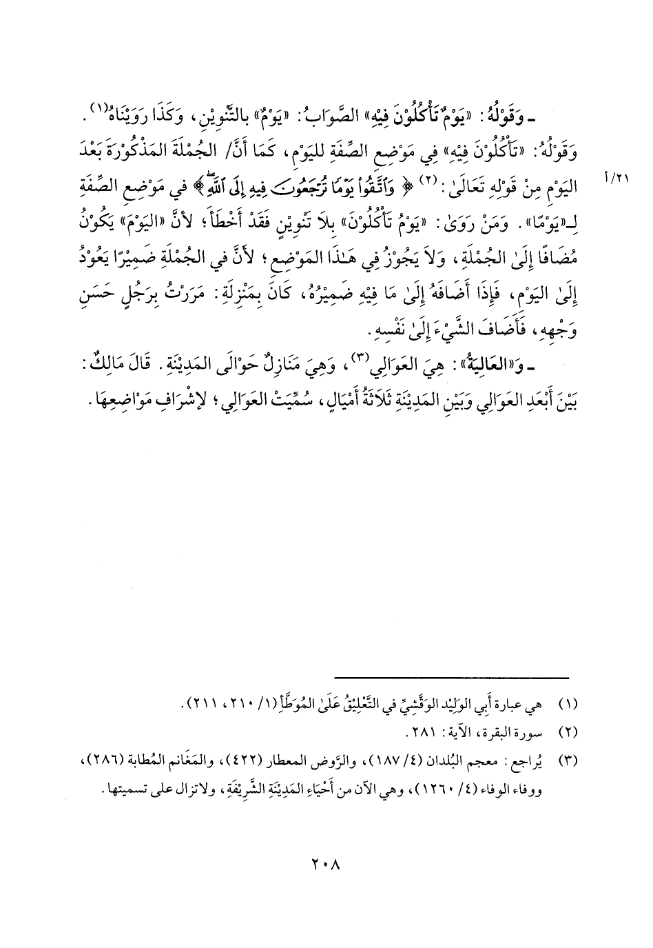 وقوله: "يوم تأكلون فيه" الصواب: "يوم" بالتنوين، وكذا رويناه. وقوله: "تأكلون فيه" في موضع الصفة لليوم، كما أن/ 21/أالجملة المذكورة بعد اليوم من قوله تعالى: {وَاتَّقُوا يَوْماً تُرْجَعُونَ فِيهِ إِلَى اللَّهِ} في موضع الصفة لـ "يوماً". ومن روى: "يوم تأكلون" بلا تنوين فقد أخطأ؛ لأن "اليوم" يكون مضافاً إلى الجملة، ولا يجوز في هذا الموضع؛ لأن في الجملة ضميراً يعود إلى اليوم، فإذا أضافه إلى ما فيه ضميره، كان بمنزلة: مررت برجل حسن وجهه، فأضاف الشيء إلى نفسه.