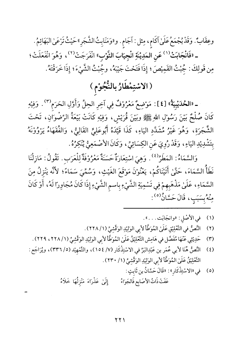"الحديبية" [4]: موضع معروف في آخر الحل وأول الحرم. وفيه كان صلح بين رسول الله صلى الله عليه وسلم وبين قريش، وفيه كانت بيعة الرضوان، تحت الشجرة، وهو غير مشدد الياء، كذا قيده أبو علي القالي، والفقهاء يروونه بتشديد الياء، وقد روي عن الكسائي، وكان الأصمعي ينكره.