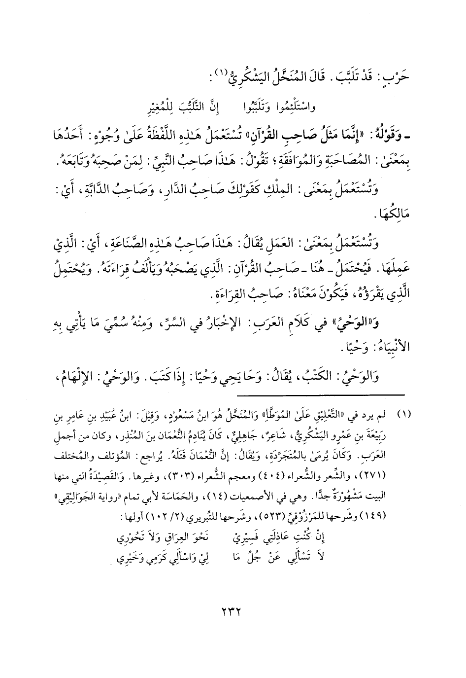 وتستعمل بمعنى: العمل يقال: هذا صاحب هذه الصناعة، أي: الذي عملها. فيحتمل- هنا- صاحب القرآن: الذي يصحبه ويألف قراءته. ويحتمل الذي يقرؤه، فيكون معناه: صاحب القراءة.
