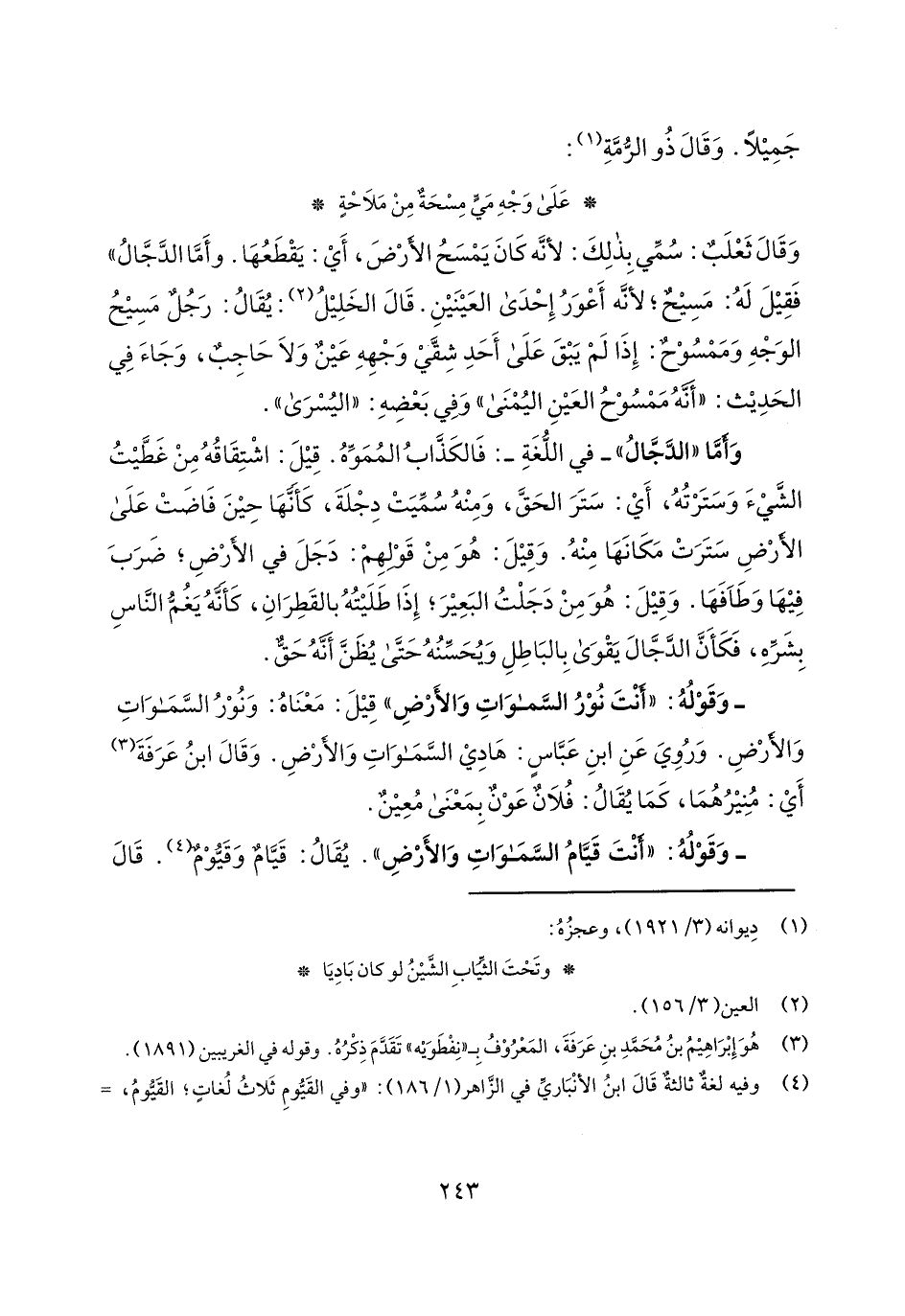 وقال ثعلب: سمي بذلك: لأنه كان يمسح الأرض، أي: يقطعها. وأما الدجال" فقيل له: مسيح؛ لأنه أعور إحدى العينين. قال الخليل: يقال: رجل مسيح الوجه وممسوح: إذا لم يبق على أحد شقي وجهه عين ولا حاجب، وجاء في الحديث: "أنه ممسوح العين اليمنى" وفي بعضه: "اليسرى".