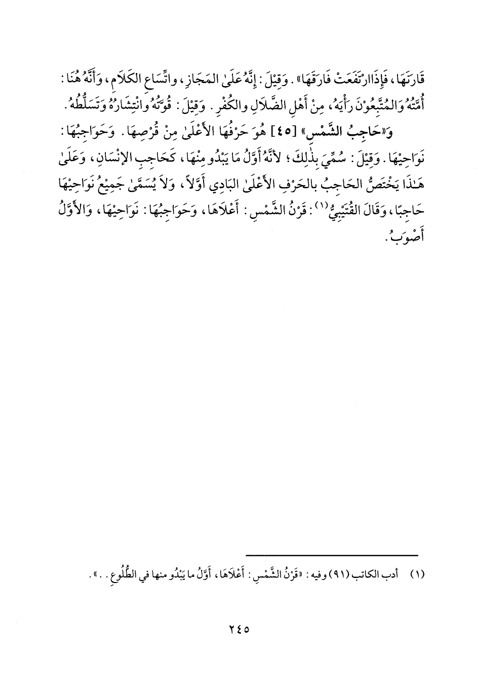 و"حاجب الشمس" [45] هو حرفها الأعلى من قرصها. وحواجبها: نواحيها. وقيل: سمي بذلك؛ لأنه أول ما يبدو منها، كحاجب الإنسان، وعلى هذا يختص الحاجب بالحرف الأعلى البادي أولاً، ولا يسمى جميع نواحيها حاجباً، وقال القتيبي: قرن الشمس: أعلاها، وحواجبها: نواحيها، والأول أصوب.