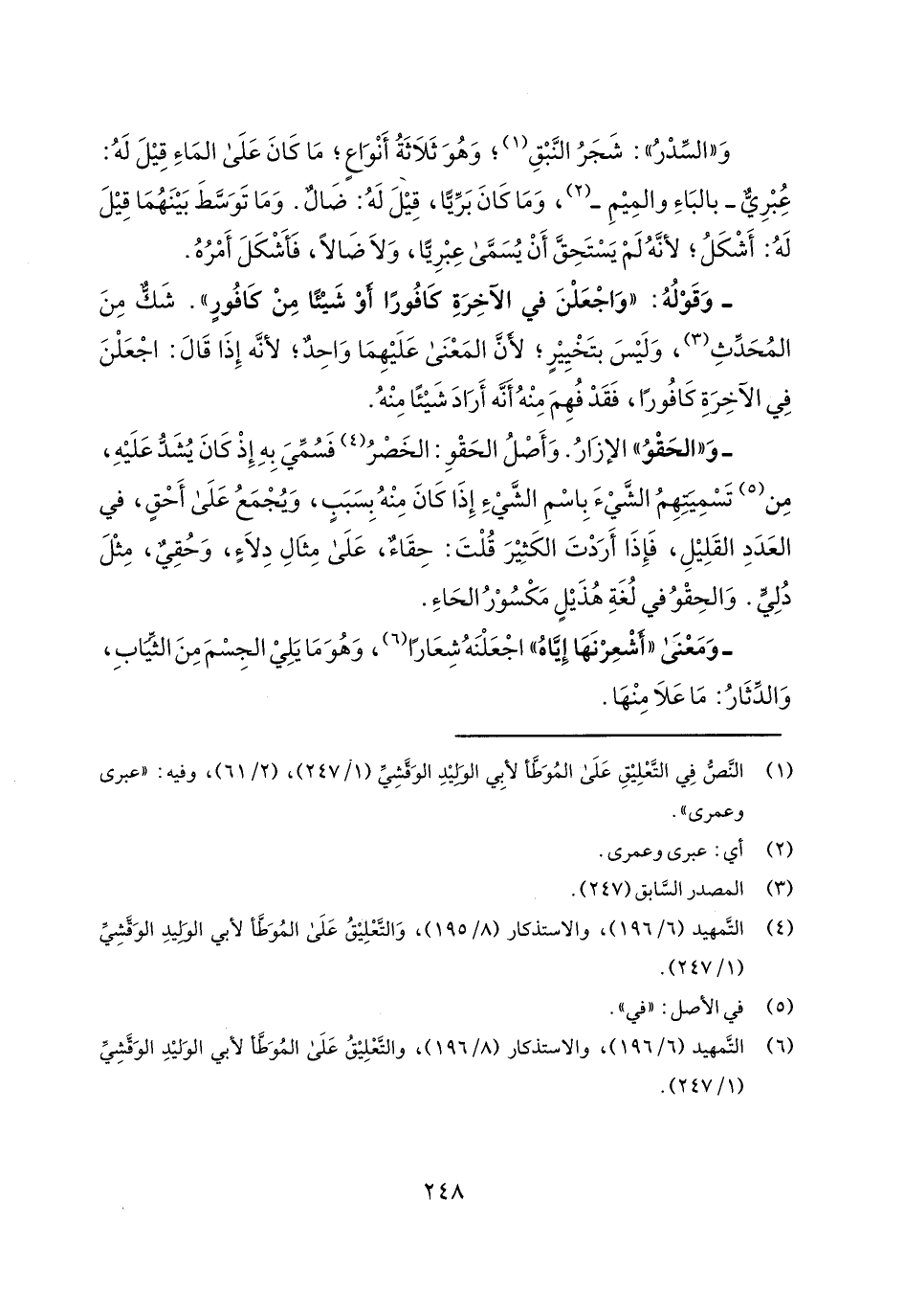 و"السدر": شجر النبق؛ وهو ثلاثة أنواع؛ ما كان على الماء قيل له: عبري- بالباء والميم-، وما كان برياً، قيل له: ضال. وما توسط بينهما قيل له: أشكل؛ لأنه لم يستحق أن يسمى عبرياً، ولا ضالاً، فأشكل أمره.