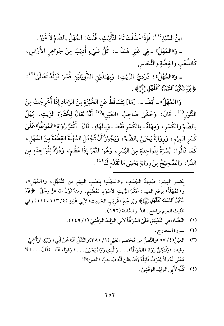 و"المهل"- أيضاً-: [ما] يتساقط عن الخبزة من الرماد إذا أخرجت من التنور. قال: وحكى صاحب "العين" أنه يقال لخثارة الزيت: مهل بالضم والكسر، ومهلة- بالكسر فقط- وبالهاء. قال: أكثر رواة "الموطأ" على كسر الميم، ورواية يحيى بالضم، ويجوز أن تجعل المهلة القطعة من المهل، كما قالوا: بسرة للواحدة من البسر، وهو التمر إذا عظم، ودرة للواحدة من الدر، والصحيح من رواية يحيى ما تقدم لنا.