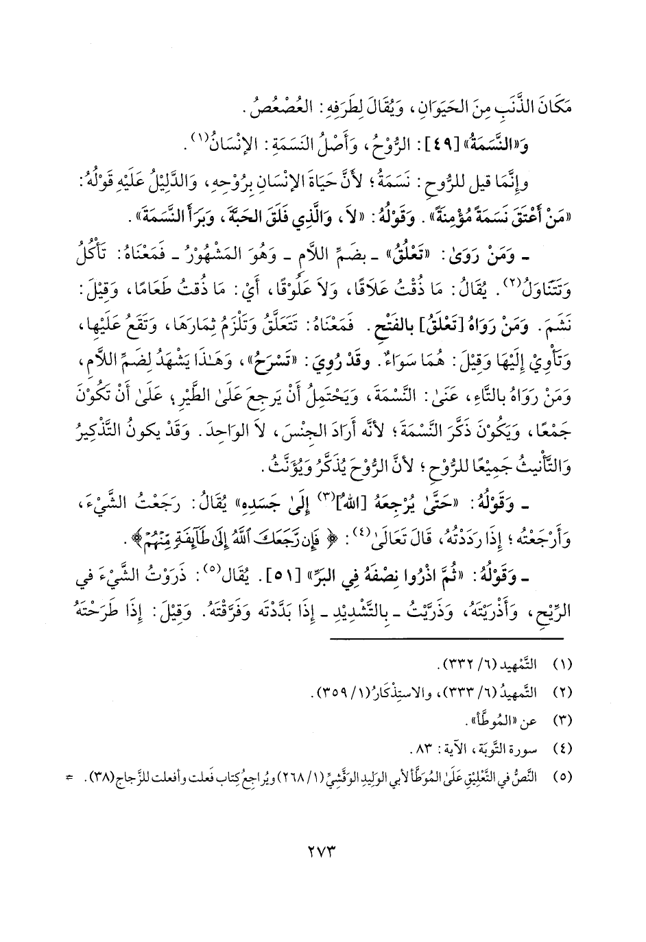 ومن روى: "تعلق"- بضم اللام- وهو المشهور- فمعناه: تأكل وتتناول. يقال: ما ذقت علاقاً، ولا علوقاً، أي: ما ذقت طعاماً، وقيل: نشم. ومن رواه [تعلق] بالفتح. فمعناه: تتعلق وتلزم ثمارها، وتقع عليها، وتأوي إليها وقيل: هما سواء. وقد روي: "تسرح"، وهذا يشهد لضم اللام، ومن رواه بالتاء، عنى: النسمة، ويحتمل أن يرجع على الطير، على أن تكون جمعاً، ويكون ذكر النسمة؛ لأنه أراد الجنس، لا الواحد. وقد يكون التذكير والتأنيث جميعاً للروح؛ لأن الروح يذكر ويؤنث.