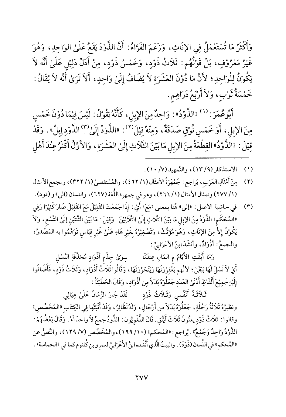وأكثر ما تستعمل في الإناث، وزعم الفراء: أن الذود يقع على الواحد، وهو غير معروف، بل قولهم: ثلاث ذود، وخمس ذود، من أدل دليل على أنه لا يكون للواحد؛ لأن ما دون العشرة لا يضاف إلى واحد، ألا ترى أنه لا يقال: خمسة ثوب، ولا أربع دراهم.
