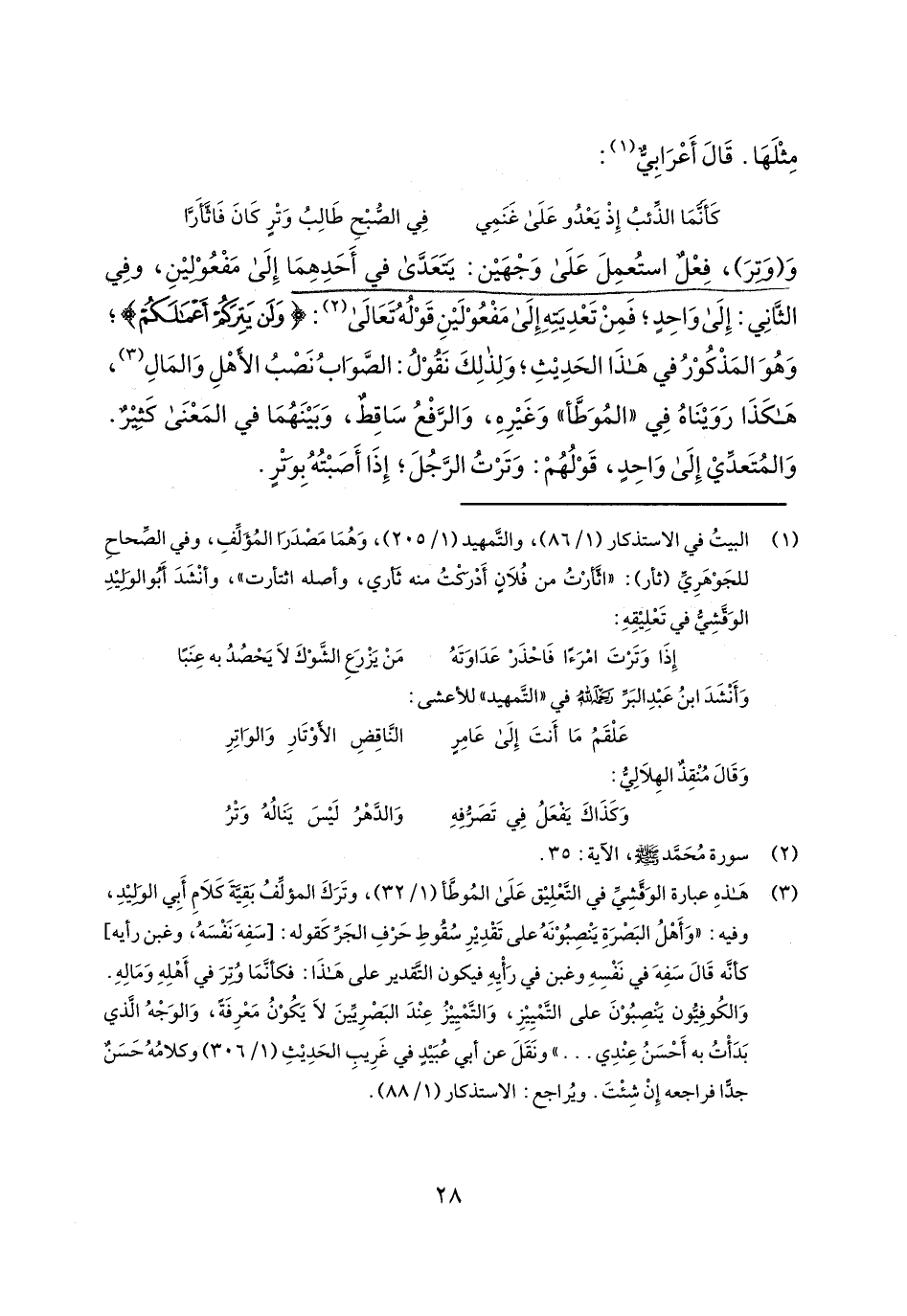 و (وتر)، فعلٌ استعمل على وجهين: يتعدى في أحدهما إلى مفعولين، وفي الثاني: إلى واحدٍ؛ فمن تعديته إلى مفعولين قوله تعالى: {وَلَنْ يَتِرَكُمْ أَعْمَالَكُمْ}؛ وهو المذكور في هذا الحديث؛ ولذلك نقول: الصواب نصب الأهل والمال، هكذا رويناه في "الموطأ" وغيره، والرفع ساقطٌ، وبينهما في المعنى كثيرٌ. والمتعدي إلى واحدٍ، قولهم: وترت الرجل؛ إذا أصبته بوترٍ.