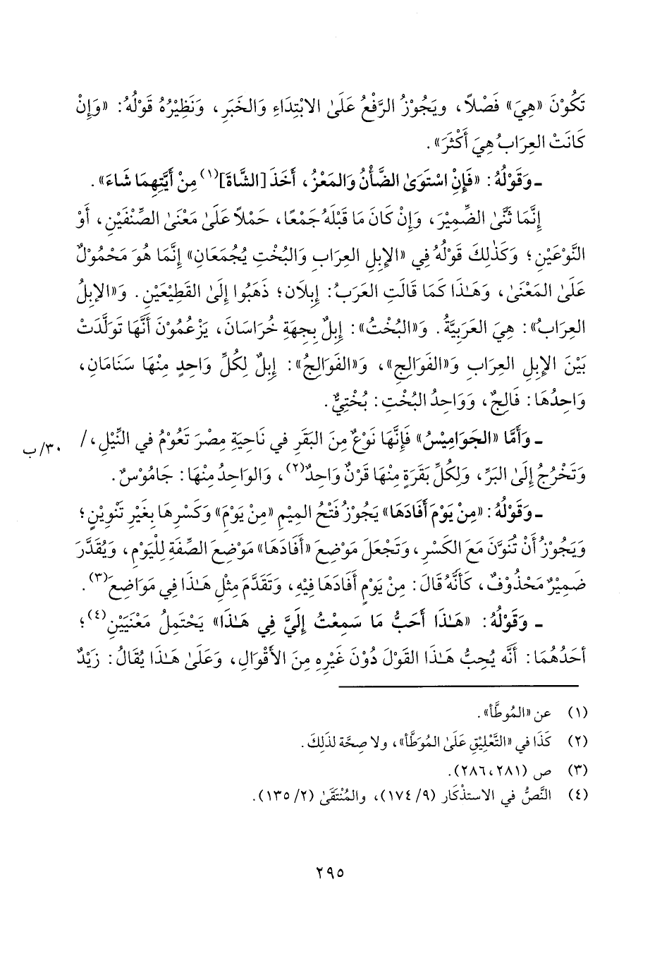 إنما ثنى الضمير، وإن كان ما قبله جمعاً، حملاً على معنى الصنفين، أو النوعين؛ وكذلك قوله في "الإبل العراب والبخت يجمعان" إنما هو محمول على المعنى، وهذا كما قالت العرب: إبلان؛ ذهبوا إلى القطيعين. و"الإبل العراب": هي العربية. و"البخت": إبل بجهة خراسان، يزعمون أنها تولدت بين الإبل العراب و"الفوالج"، و"الفوالج": إبل لكل واحد منها سنامان، واحدها: فالج، وواحد البخت: بختي.