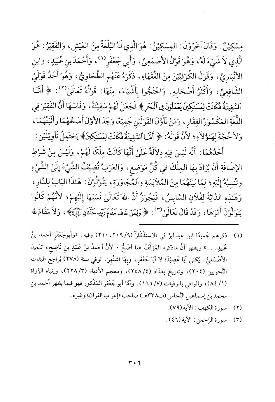 مسكين. وقال آخرون: المسكين: هو الذي له البلغة من العيش، والفقير: هو الذي لا شيء له، وهو قول الأصمعي، وأبي جعفر، وأحمد بن عبيد، وابن الأنباري، وقول الكوفيين من الفقهاء، ذكره عنهم الطحاوي، وهو أحد قولي الشافعي، وأكثر أصحابه. واحتجوا بأشياء، منها: قوله تعالى: {أمَّا السَّفِينَةُ فَكَانَتْ لِمَسَاكِينَ يَعْمَلُونَ فِي الْبَحْرِ} فجعل لهم سفينة، وقاسها أن الفقير في اللغة المكسور الفقار، ومن تأول القولين جميعاً وجد الأول أصحهما وأثبتهما، ولا حجة لهؤلاء؛ لأن قوله: {أمَّا السَّفِينَةُ فَكَانَتْ لِمَسَاكِينَ} يحتمل تأويلين: