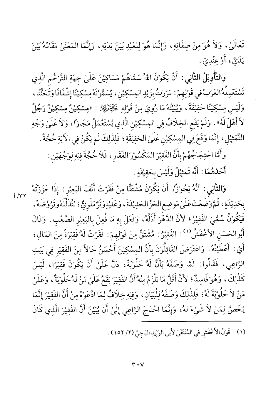 والتأويل الثاني: أن يكون الله سماهم مساكين على جهة الترحم الذي تستعمله العرب في قولهم: مررت بزيد المسكين، يسمونه مسكيناً إشفاقاً وتحنناً، وليس مسكيناً حقيقة، ويبينه ما روي من قوله عليه السلام: "مسكين مسكين رجل لا أهل له". ولم يقع الخلاف في المسكين الذي يستعمل مجازاً، ولا على وجه التمثيل، إنما وقع في المسكين على الحقيقة؛ فلذلك لم يكن في الآية حجة.
