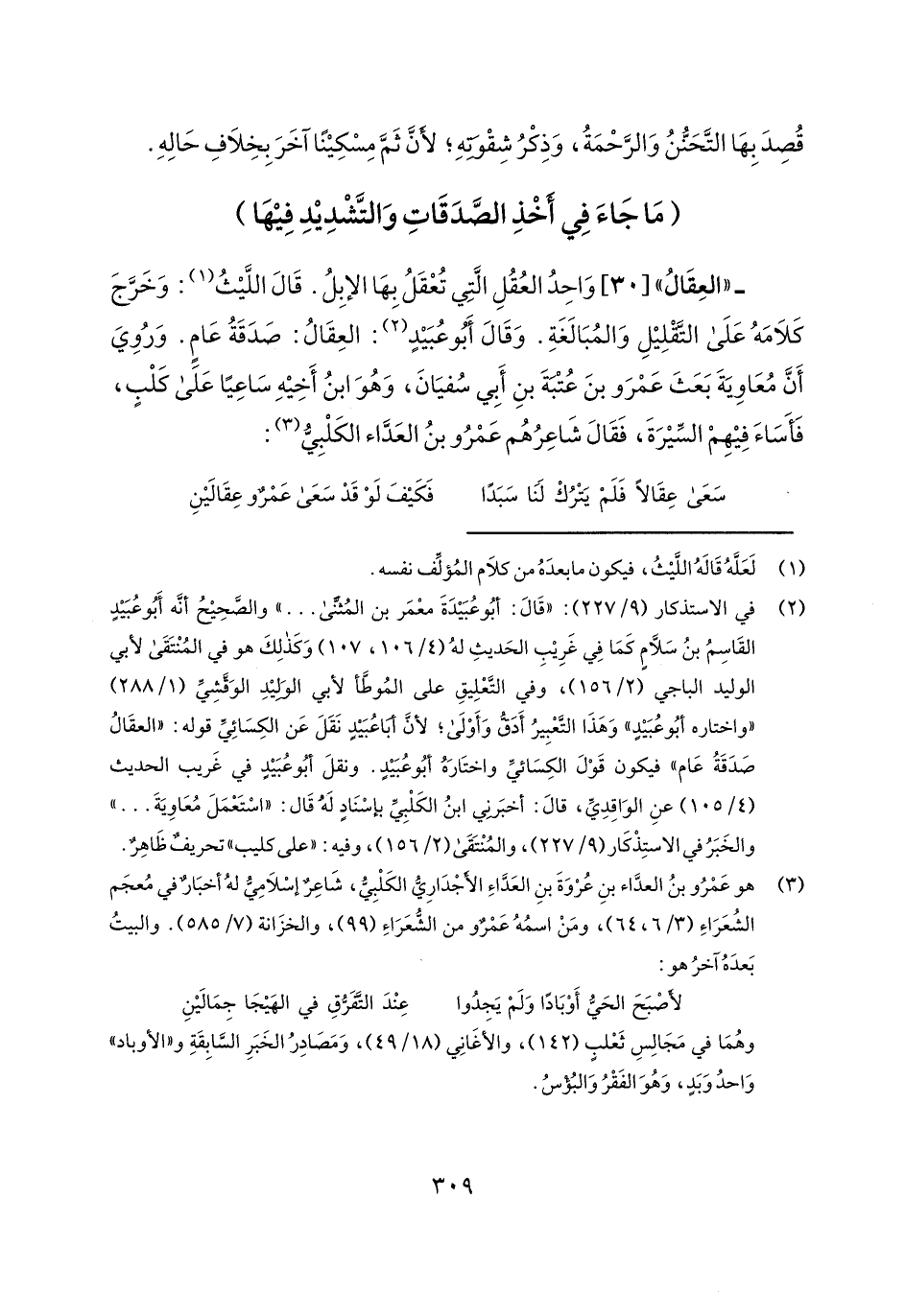 "العقال" [30] واحد العقل التي تعقل بها الإبل. قال الليث: وخرج كلامه على التقليل والمبالغة. وقال أبو عبيد: العقال: صدقة عام. وروي أن معاوية بعث عمرو بن عتبة بن أبي سفيان، وهو ابن أخيه ساعياً على كلب، فأساء فيهم السيرة، فقال شاعرهم عمرو بن العداء الكلبي: