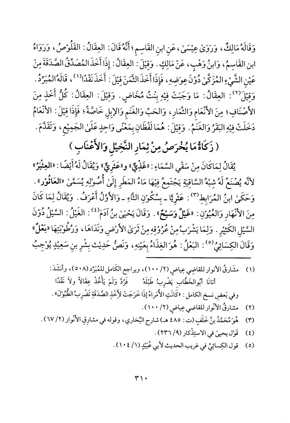 يقال لما كان من سقي السماء: "غذي" و"عثري" ويقال له أيضاً: "العثير" لأنه يصنع له شبه الساقية يجتمع فيها ماء المطر إلى أصوله يسمى "العاثور". وحكى ابن المرابط: عثرياً- بسكون الثاء- والأول أعرف. ويقال لما كان من الأنهار والعيون: "غيل وسيح". وقال يحيى بن آدم: الغيل: السيل دون السيل الكثير. ولما يشرب من عروقه من ثرى الأرض ونداها، ورطوبتها "بعل" وقال الكسائي: البعل: هو الغذاء بعينه، ونص حديث بشر بن سعيد يوجب