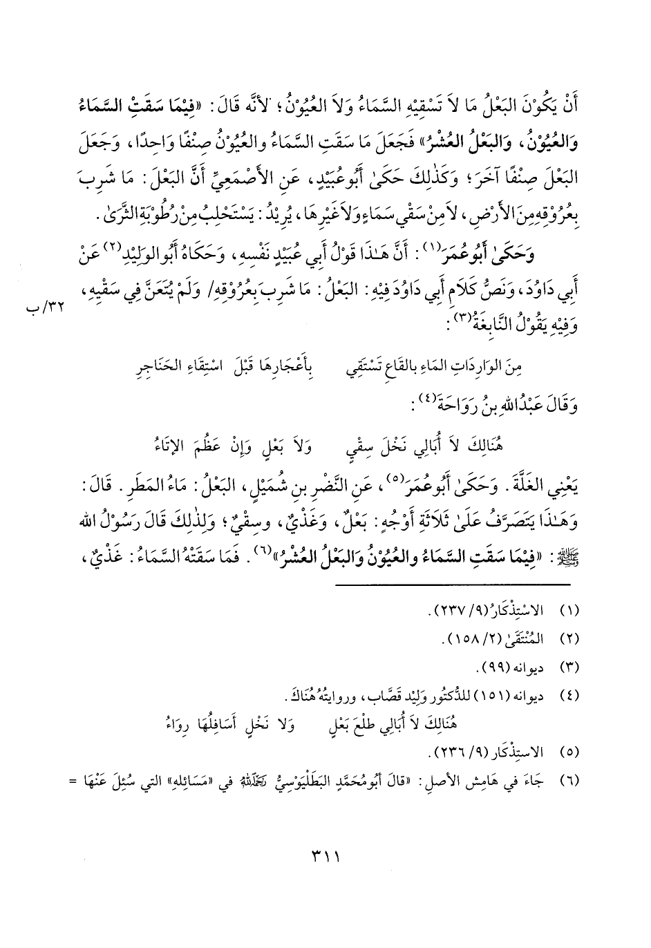 وحكى أبو عمر: أن هذا قول أبي عبيد نفسه، وحكاه أبو الوليد عن أبي داود، ونص كلام أبي داود فيه: البعل: ما شرب بعروقه/ 32/ب ولم يتعن في سقيه، وفيه يقول النابغة: