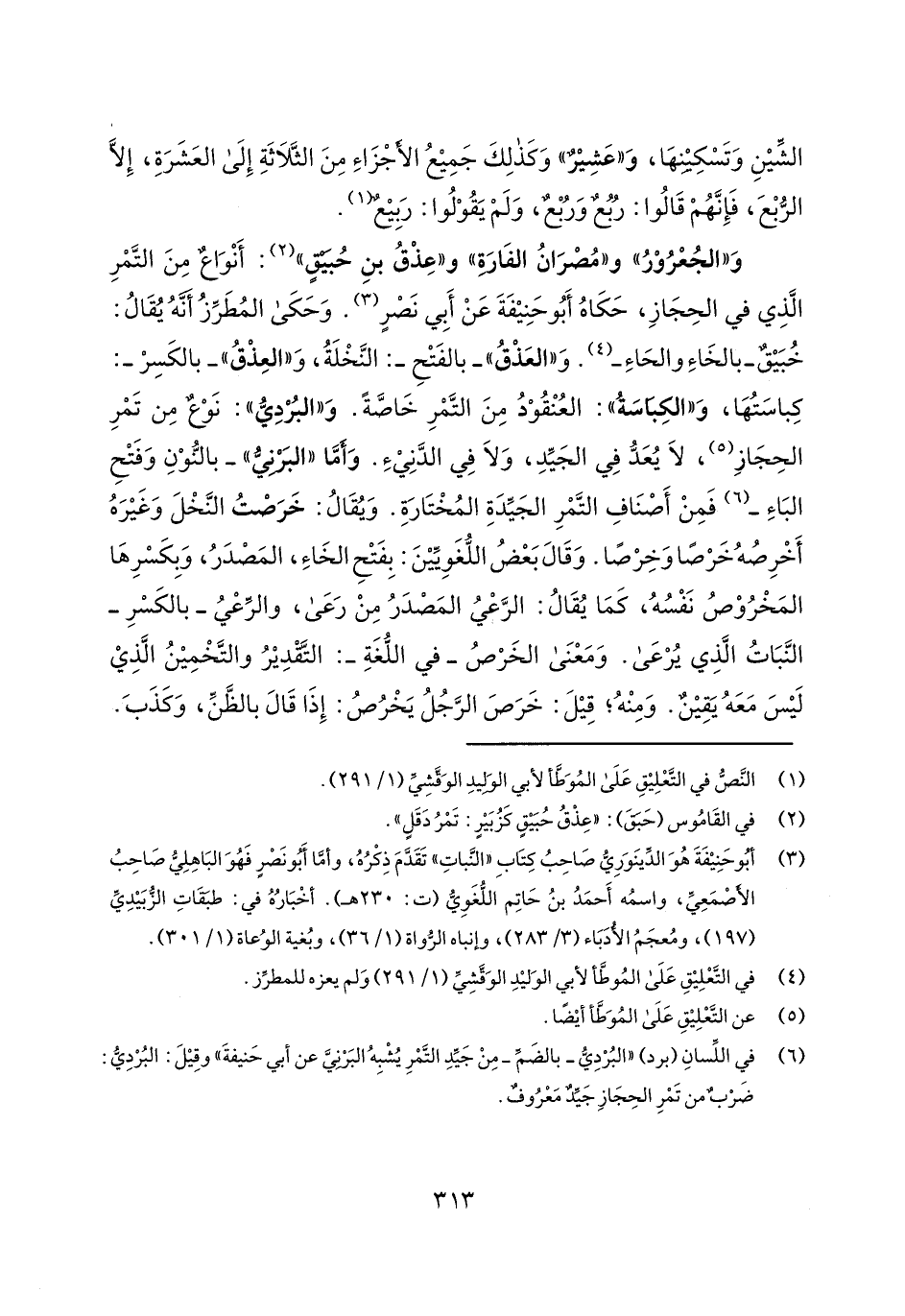 و"الجعرور" و"مصران الفارة" و"عذق بن حبيق": أنواع من التمر الذي في الحجاز، حكاه أبو حنيفة عن أبي نصر. وحكى المطرز أنه يقال: خبيق- بالخاء والحاء-. و"العذق"- بالفتح-: النخلة، و"العذق"- بالكسر-: كباستها، و"الكباسة": العنقود من التمر خاصة. و"البردي": نوع من تمر الحجاز، لا يعد في الجيد، ولا في الدنيء. وأما "البرني"- بالنون وفتح الباء- فمن أصناف التمر الجيدة المختارة. ويقال: خرصت النخل وغيره أخرصه خرصاً وخرصاً. وقال بعض اللغويين: بفتح الخاء، المصدر، وبكسرها المخروص نفسه، كما يقال: الرعي المصدر من رعى، والرعي- بالكسر- النبات الذي يرعى. ومعنى الخرص- في اللغة-: التقدير والتخمين الذي ليس معه يقين. ومنه؛ قيل: خرص الرجل يخرص: إذا قال بالظن، وكذب.