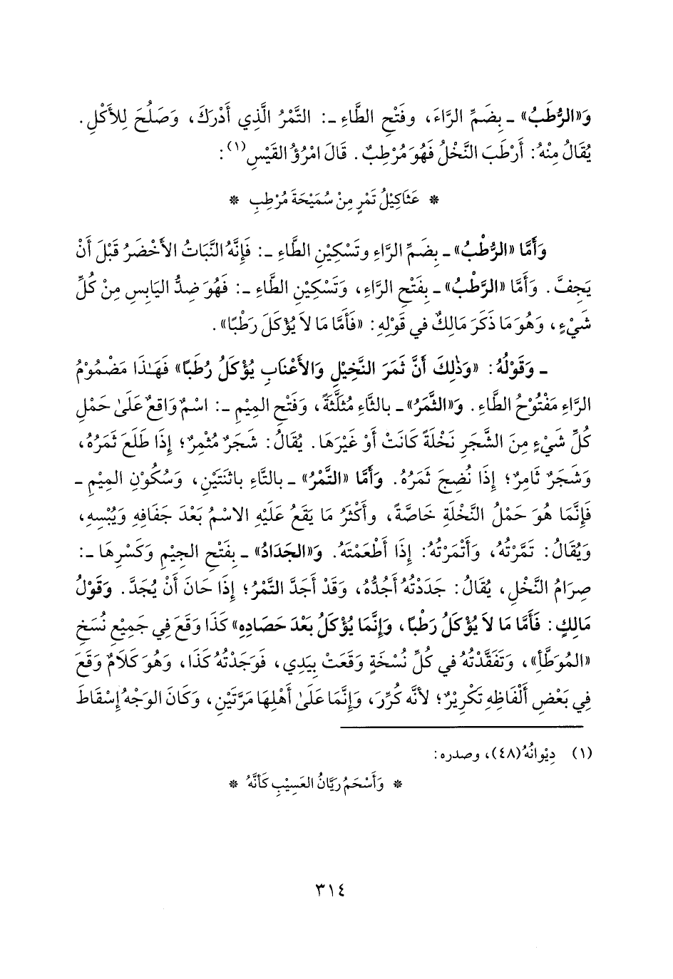 وأما "الرطب"- بضم الراء وتسكين الطاء-: فإنه النبات الأخضر قبل أن يجف. وأما "الرطب"- بفتح الراء، وتسكين الطاء: فهو ضد اليابس من كل شيء، وهو ما ذكر مالك في قوله: "فأما ما لا يؤكل رطباً".