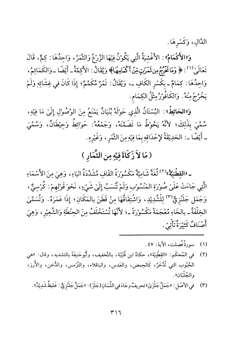 و"الأكمام": الأغشية التي يكون فيها الزرع والثمر، واحدها: كم، قال تعالى: {وَمَا تَخْرُجُ مِنْ ثَمَرَاتٍ مِنْ أَكْمَامِهَا} ويقال: الأكمة- أيضاً- والكمائم، واحدها: كمام- بكسر الكاف-، ويقال: تمر مكمم؛ إذا كان في غشائه ولم يخرج منه. والكافور مثل الكمام.