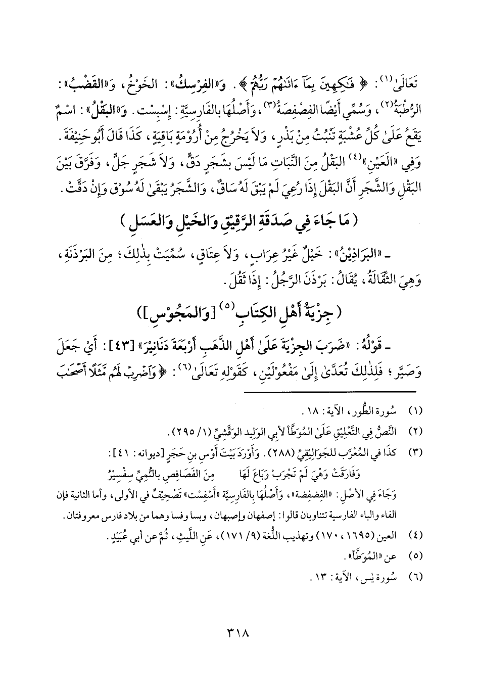 تعالى: {فَاكِهِينَ بِمَا آتَاهُمْ رَبُّهُمْ}. و"الفرسك": الخوخ، و"القضب": الرطبة، وسمي أيضاً الفصفصة، وأصلها بالفارسية: إسبست. و"البقل": اسم يقع على كل عشبة تنبت من بذر، ولا يخرج من أرومة باقية، كذا قال أبو حنيفة. وفي "العين" البقل من النبات ما ليس بشجر دق، ولا شجر جل، وفرق بين البقل والشجر أن البقل إذا رعي لم يبق له ساق، والشجر يبقى له سوق وإن دقت.