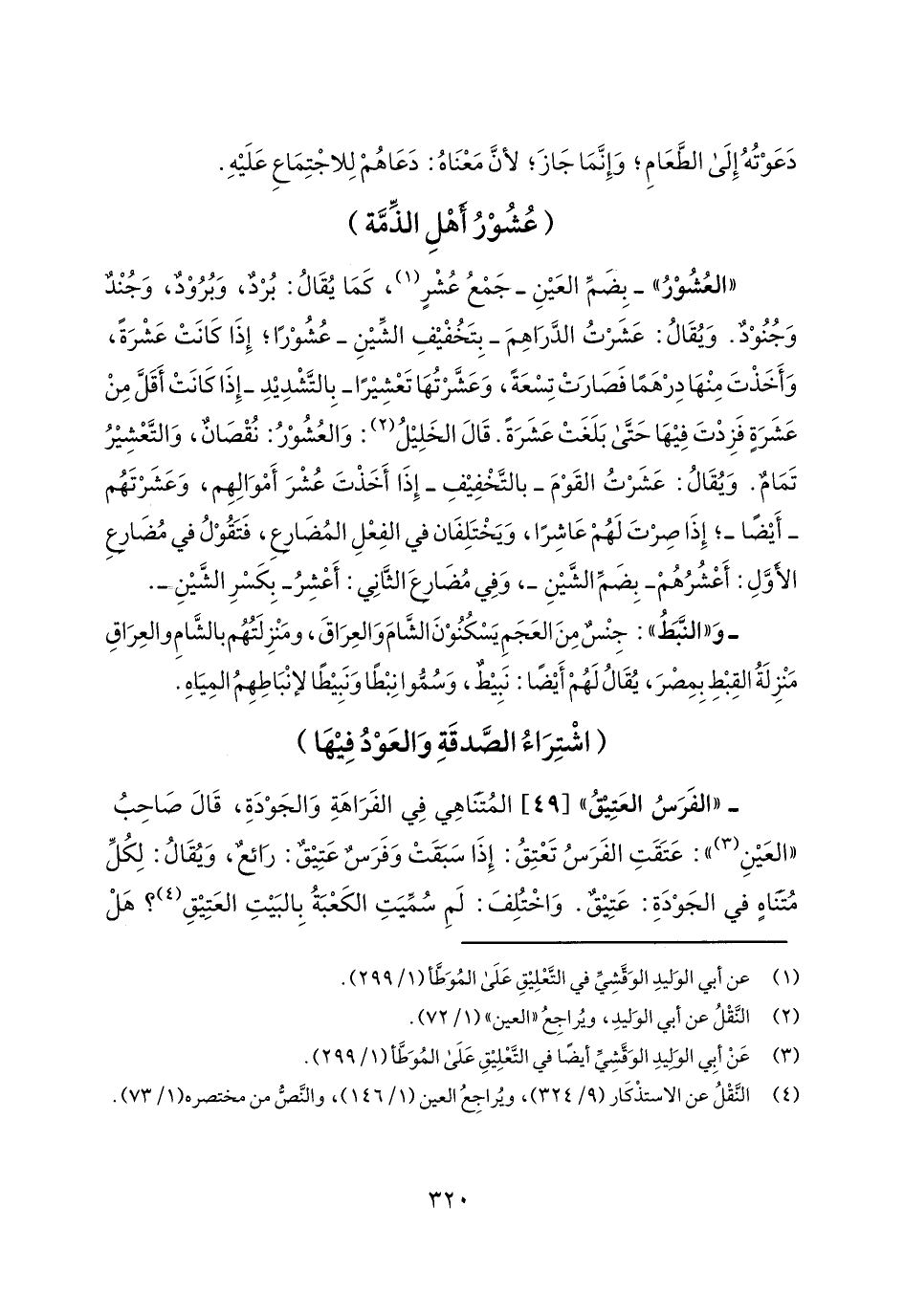 "العشور"- بضم العين- جمع عشر، كما يقال: برد، وبرود، وجند وجنود. ويقال: عشرت الدراهم- بتخفيف الشين- عشوراً؛ إذا كانت عشرة، وأخذت منها درهماً فصارت تسعة، وعشرتها تعشيراً- بالتشديد- إذا كانت أقل من عشرة فزدت فيها حتى بلغت عشرة. قال الخليل: والعشور: نقصان، والتعشير تمام. ويقال: عشرت القوم- بالتخفيف- إذا أخذت عشر أموالهم، وعشرتهم- أيضاً-؛ إذا صرت لهم عاشراً، ويختلفان في الفعل المضارع، فتقول في مضارع الأول: أعشرهم- بضم الشين-، وفي مضارع الثاني: أعشر- بكسر الشين-.