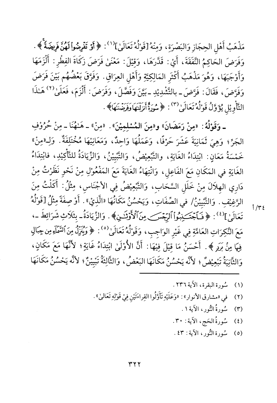 وقوله: "من رمضان" و"من المسلمين". "من"- ههنا- من حروف الجر؛ وهي ثمانية عشر حرفاً، وعملها واحد، ومعانيها مختلفة. ولـ "من" خمسة معان: ابتداء الغاية، والتبعيض، والتبيين، والزيادة للتأكيد، فابتداء الغاية في المكان مع الفاعل، وانتهاء الغاية مع المفعول من نحو نظرت من داري الهلال من خلل السحاب، والتبعيض في الأجناس، مثل: أكلت من الرغيف. والتبيين/ 34/أفي الصفات، ويحسن مكانها "الذي". أو صفة مثل [قوله تعالى]: {فَاجْتَنِبُوا الرِّجْسَ مِنْ الأَوْثَانِ}. والزيادة- بثلاث شرائط-، مع النكرات العامة في غير الواجب، وقوله تعالى: {وَيُنَزِّلُ مِنْ السَّمَاءِ مِنْ جِبَالٍ فِيهَا مِنْ بَرَدٍ}. أحسن ما قيل فيها: أن الأولى ابتداء غاية؛ لأنها مع مكان، والثانية تبعيض؛ لأنه يحسن مكانها البعض، والثالثة تبيين؛ لأنه يحسن مكانها