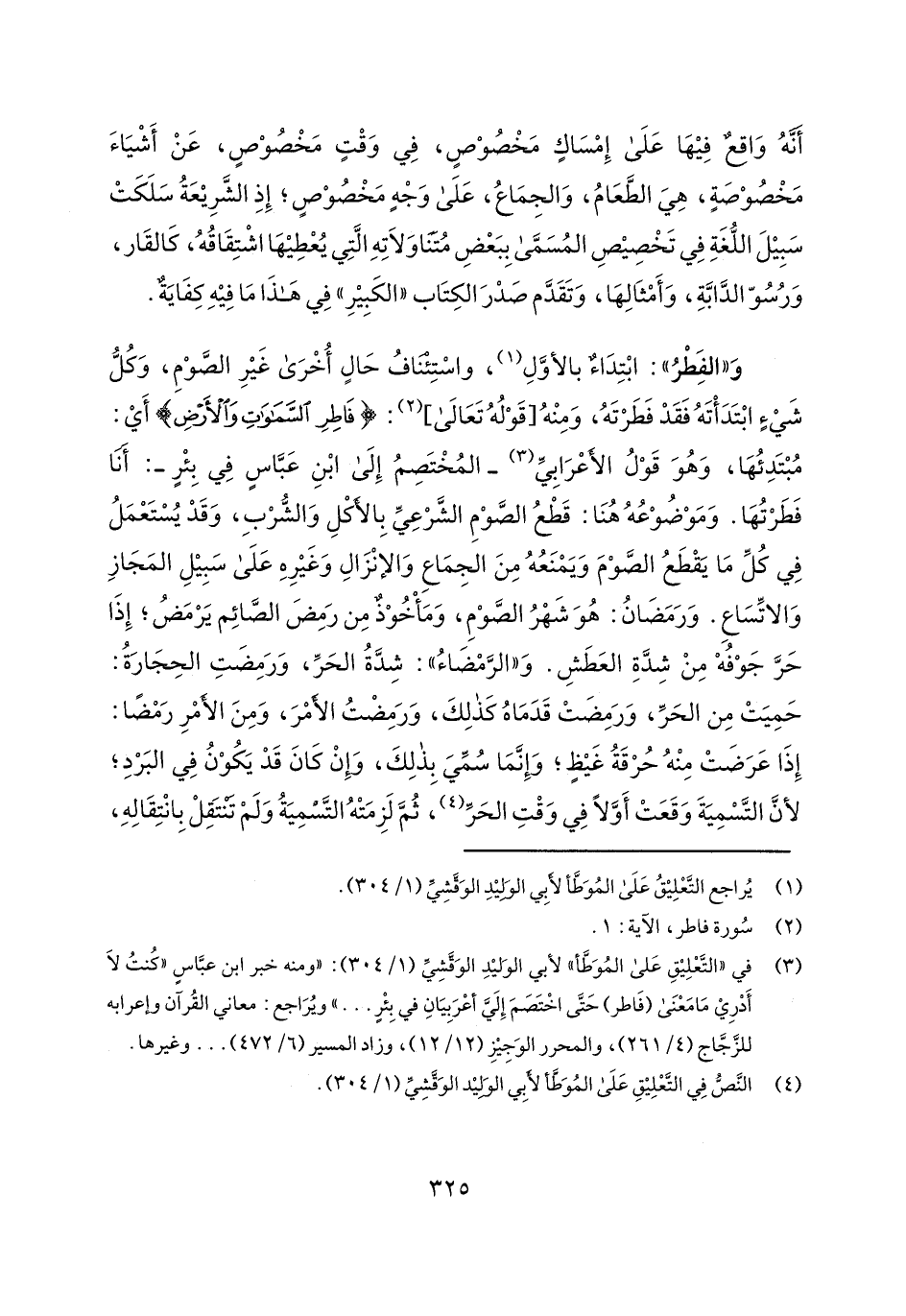 و"الفطر": ابتداء بالأول، واستئناف حال أخرى غير الصوم، وكل شيء ابتدأته فقد فطرته، ومنه [قوله تعالى]: {فَاطِرِ السَّمَوَاتِ وَالأَرْضِ} أي: مبتدئها، وهو قول الأعرابي- المختصم إلى ابن عباس في بئر-: أنا فطرتها. وموضوعه هنا: قطع الصوم الشرعي بالأكل والشرب، وقد يستعمل في كل ما يقطع الصوم ويمنعه من الجماع والإنزال وغيره على سبيل المجاز والاتساع. ورمضان: هو شهر الصوم، ومأخوذ من رمض الصائم يرمض؛ إذا حر جوفه من شدة العطش. و"الرمضاء": شدة الحر، ورمضت الجارة: حميت من الحر، ورمضت قدماه كذلك، ورمضت الأمر، ومن الأمر رمضاً: إذا عرضت منه حرقة غيظ؛ وإنما سمي بذلك، وإن كان قد يكون في البرد؛ لأن التسمية وقعت أولاً في وقت الحر، ثم لزمته التسمية ولم تنتقل بانتقاله،