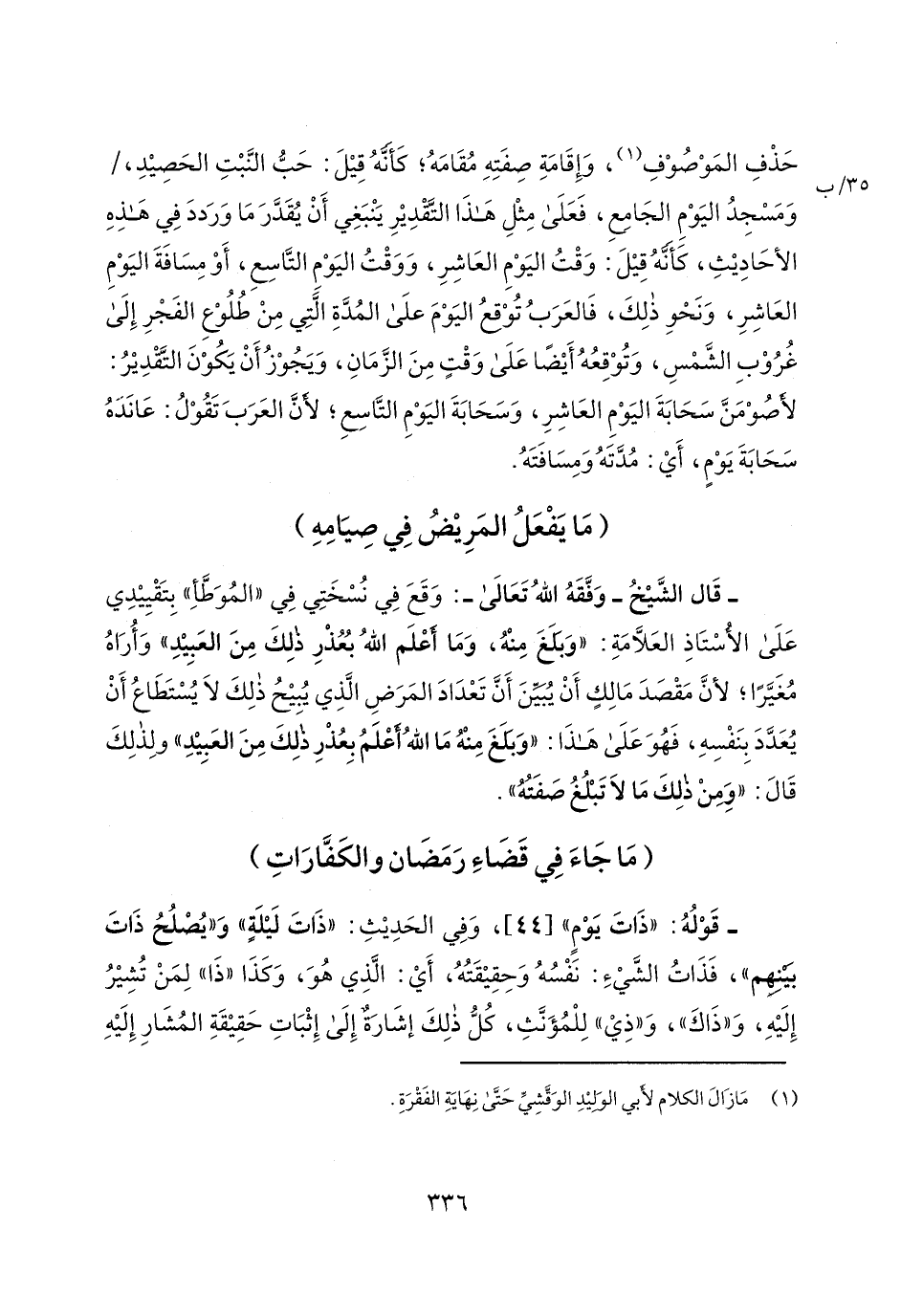 قال الشيخ- وفقه الله تعالى-: وقع في نسختي في "الموطأ" بتقييدي على الأستاذ العلامة: "وبلغ منه، وما أعلم الله بعذر ذلك من العبيد" وأراه مغيراً؛ لأن مقصد مالك أن يبين أن تعداد المرض الذي يبيح ذلك لا يستطاع أن يعدد بنفسه، فهو على هذا: "وبلغ منه ما الله أعلم بعذر ذلك من العبيد" ولذلك قال: "ومن ذلك ما لا تبلغ صفته".
