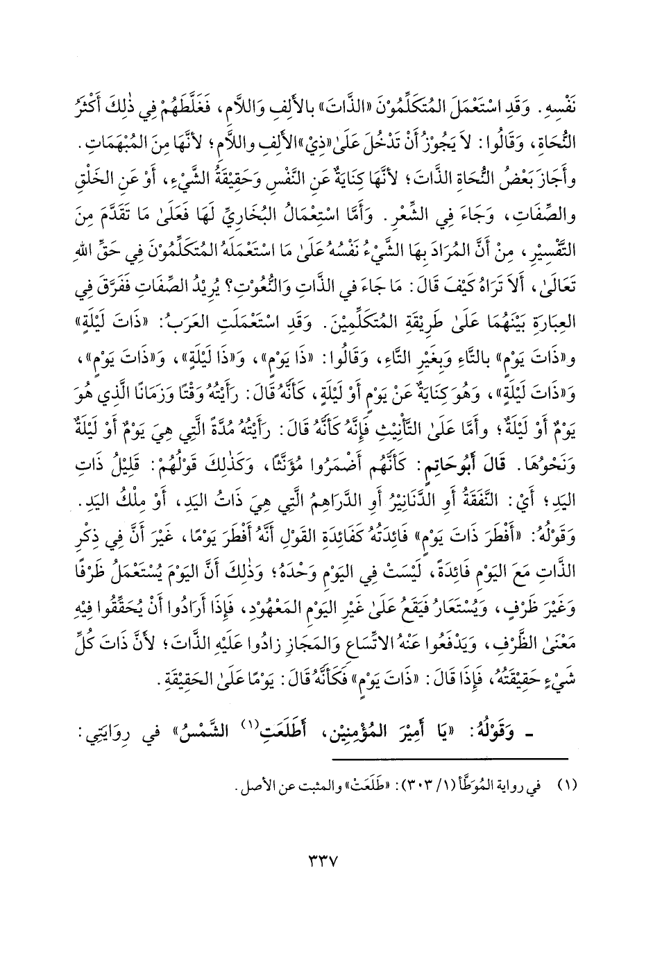 نفسه. وقد استعمل المتكلمون "الذات" بالألف واللام، فغلطهم في ذلك أكثر النحاة، وقالوا: لا يجوز أن تدخل على "ذي" الألف واللام؛ لأنها من المبهمات. وأجاز بعض النحاة الذات؛ لأنها كناية عن النفس وحقيقة الشيء، أو عن الخلق والصفات، وجاء في الشعر. وأما استعمال البخاري لها فعلى ما تقدم من التفسير، من أن المراد بها الشيء نفسه على ما استعمله المتكلمون في حق الله تعالى، ألا تراه كيف قال: ما جاء في الذات والنعوت؟ يريد الصفات ففرق في العبارة بينهما على طريقة المتكلمين. وقد استعملت العرب: "ذات ليلة" و"ذات يوم" بالتاء وبغير التاء، وقالوا: "ذا يوم"، و"ذا ليلة"، و"ذات يوم"، و"ذات ليلة"، وهو كناية عن يوم أو ليلة، كأنه قال: رأيته وقتاً وزوماناً الذي هو يوم أو ليلة؛ وأما على التأنيث فإنه كأنه قال: رأيته مدة التي هي يوم أو ليلة ونحوها. قال أبو حاتم: كأنهم أضمروا مؤنثاً، وكذلك قولهم: قليل ذات اليد؛ أي: النفقة أو الدنانير أو الدراهم التي هي ذات اليد، أو ملك اليد. وقوله: "أفطر ذات يوم" فائدته كفائدة القول أنه أفطر يوماً، غير أن في ذكر الذات مع اليوم فائدة، ليست في اليوم وحده؛ وذلك أن اليوم يستعمل ظرفاً وغير ظرف، ويستعار فيقع على غير اليوم المعهود، فإذا أرادوا أن يحققوا فيه معنى الظرف، ويدفعوا عنه الاتساع والمجاز زادوا عليه الذات؛ لأن ذات كل شيء حقيقته، فإذا قال: "ذات يوم" فكأنه قال: يوماً على الحقيقة.