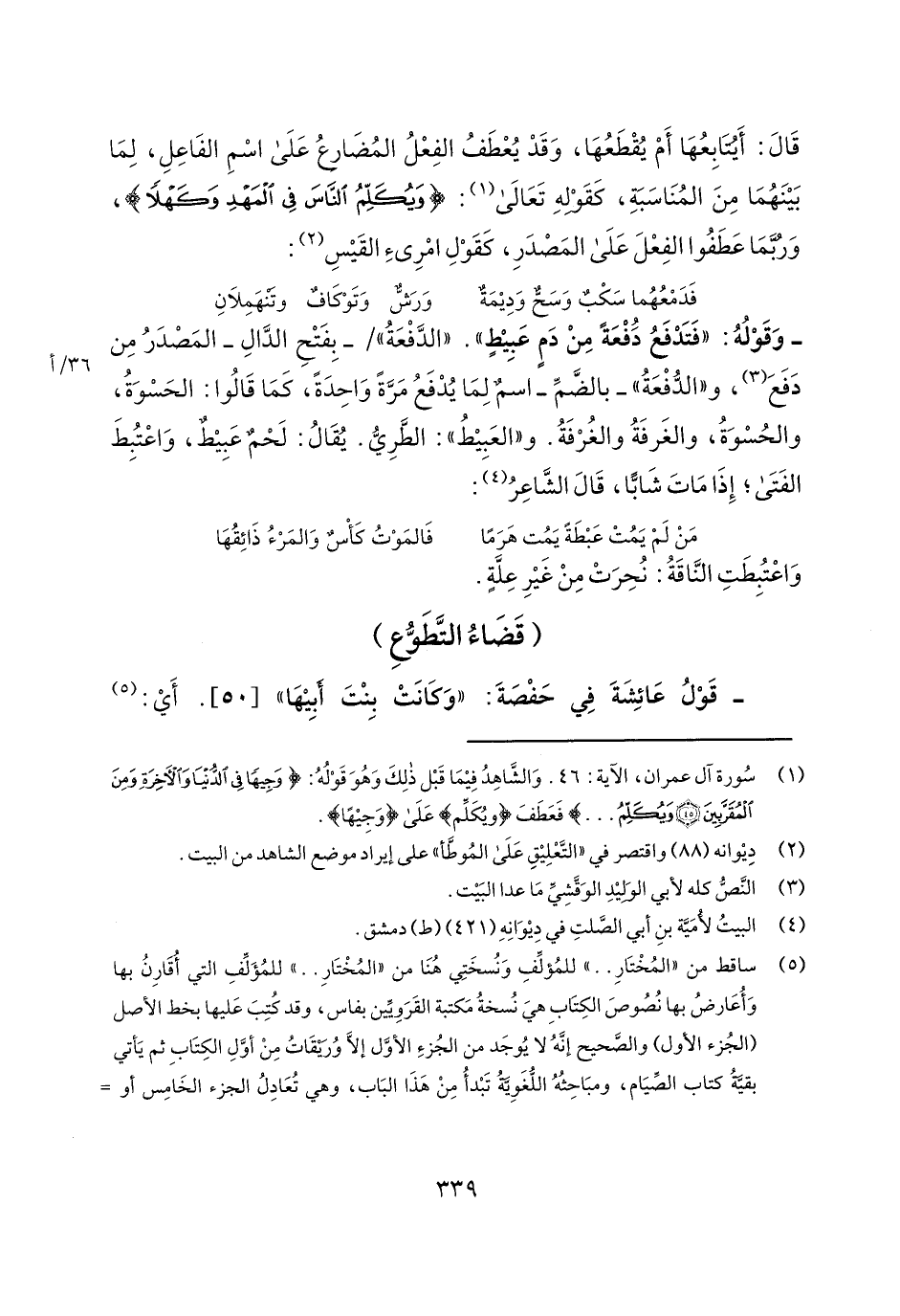 قال: أيتابعها أم يقطعها، وقد يعطف الفعل المضارع على اسم الفاعل، لما بينهما من المناسبة، كقوله تعالى: {وَيُكَلِّمُ النَّاسَ فِي الْمَهْدِ وَكَهْلاً}، ورمبا عطفوا الفعل على المصدر، كقول امرئ القيس: