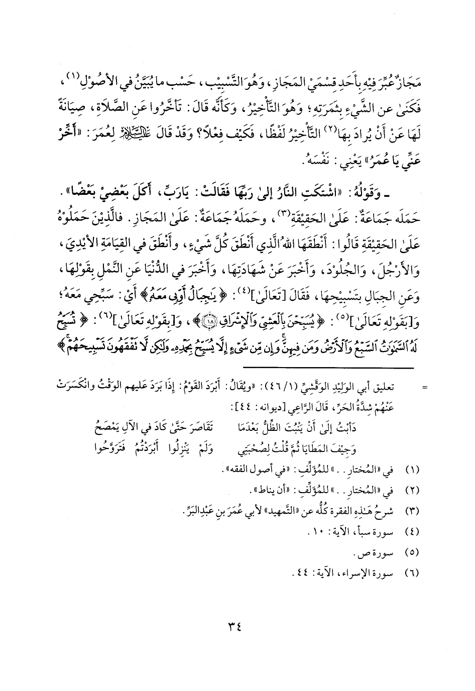 - وقوله: "اشتكت النار إلى ربها فقالت: يا رب:، أكل بعضي بعضاً". حمله جماعةٌ: على الحقيقة، وحمله جماعةٌ: على المجاز. فالذين حملوه على الحقيقة قالوا: أنطقها الله الذي أنطق كل شيءٍ، وأنطق في القيامة الأيدي، والأرجل، والجلود، وأخبر عن شهادتها، وأخبر في الدنيا عن النمل بقولها، وعن الجبال بتسبيحها، فقال [تعالى]: {يَا جِبَالُ أَوِّبِي مَعَهُ} أي: سبحي معه؛ و [بقوله تعالى]: {يُسَبِّحْنَ بِالْعَشِيِّ وَالْإِشْرَاقِ}، و [بقوله تعالى]: {تُسَبِّحُ لَهُ السَّمَاوَاتُ السَّبْعُ وَالْأَرْضُ وَمَنْ فِيهِنَّ وَإِنْ مِنْ شَيْءٍ إِلَّا يُسَبِّحُ بِحَمْدِهِ وَلَكِنْ لَا تَفْقَهُونَ تَسْبِيحَهُمْ}