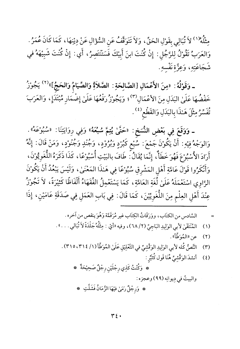ووقع في بعض النسخ: "حتى يتم سبعه" وفي روايتنا: "سبوعه". والوجه فيه: أن يكون جمع: سبع كبرد وبرود، وجند وجنود، ومن قال: إنه أراد الأسبوع فهو خطأ، إنما يقال: طاف بالبيت أسبوعاً، كذا ذكره اللغويون، وأنكروا قول عامة أهل المشرق سبوعاً في هذا المعنى، وليس يبعد أن يكون الراوي استعمله على لغة العامة، كما يستعمل الفقهاء ألفاظاً كثيرة، لا تجوز عند أهل العلم من اللغويين، كما قال: في باب العمل في صدقة عامين، إذا