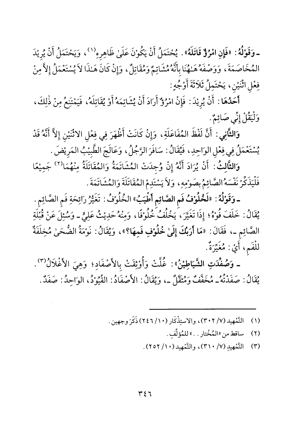 وقوله: "فإن امرؤ قاتله". يحتمل أن يكون على ظاهره، ويحتمل أن يريد المخاصمة، ووصفه ههنا بأنه مشاتم ومقاتل، وإن كان هذا لا يستعمل إلا من فعل اثنين، يحتمل ثلاثة أوجه: