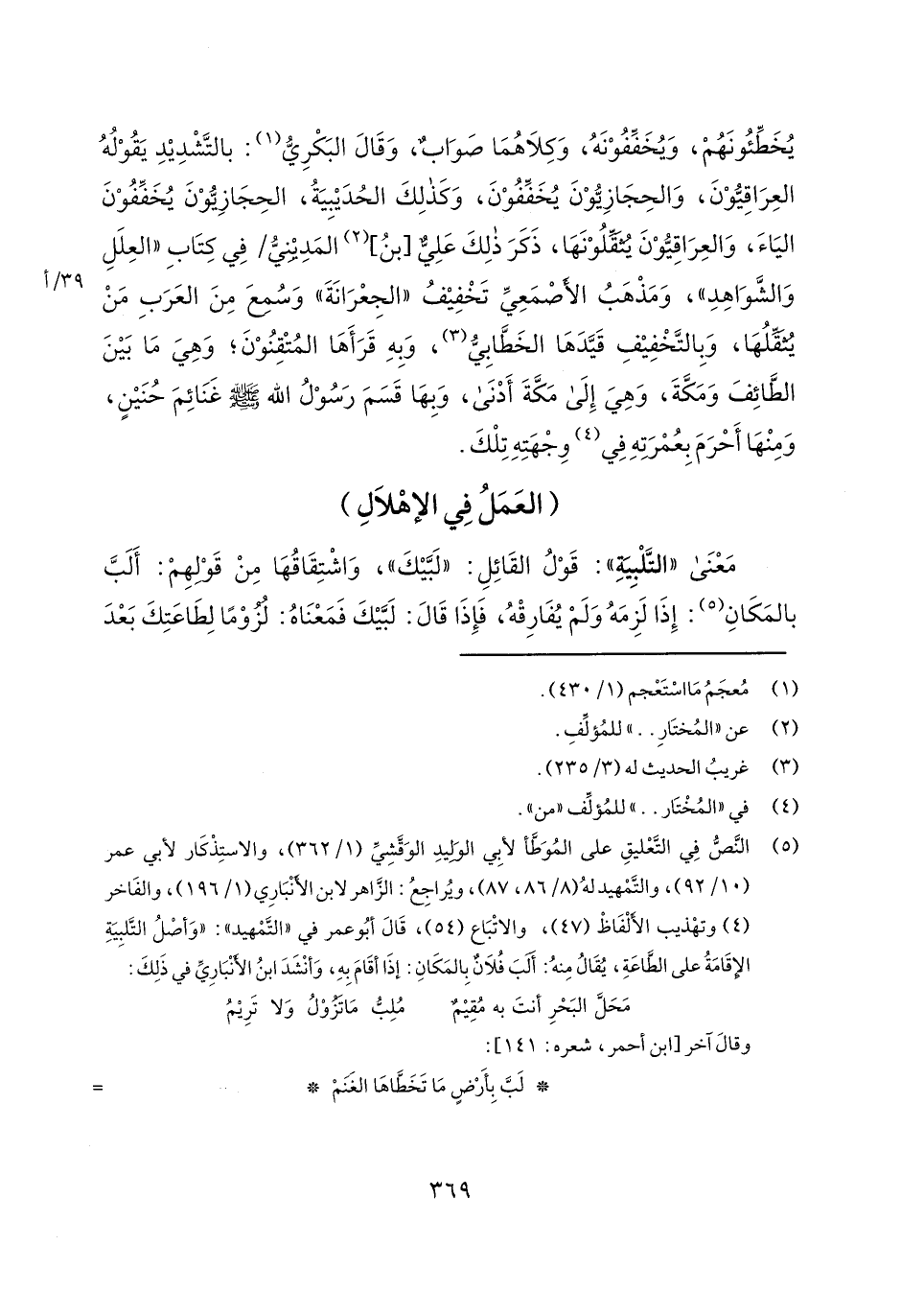 يخطئونهم، ويخففونه، وكلاهما صواب، وقال البكري: بالتشديد يقوله العراقيون، والحجازيون يخففون، وكذلك الحديبية، الحجازيون يخففون الياء، والعراقيون يثقلونها، ذكر ذلك علي [بن] المديني/ 39/أفي كتاب "العلل والشواهد"، ومذهب الأصمعي تخفيف "الجعرانة" وسمع من العرب من يثقلها، وبالتخفيف قيدها الخطابي، وبه قرأها المتقنون؛ وهي ما بين الطائف ومكة، وهي إلى مكة أدنى، وبها قسم رسول الله صلى الله عليه وسلم غنائم حنين، ومنها أحرم بعمرته في وجهته تلك.