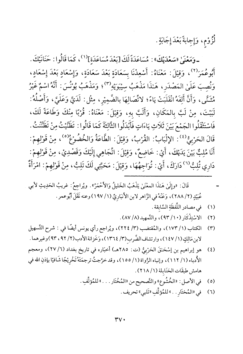 ومعنى "سعديك": مساعدة لك [بعد مساعدة]، كما قالوا: حنانيك. أبو عمر، وقيل: معناه: أسعدنا بسعادة بعد سعادة، وإسعاد بعد إسعاد، ونصب على المصدر، هذا مذهب سيبويه؛ ومذهب يونس: أنه اسم غير مثنى، وأن ألفه انقلبت ياء؛ لاتصالها بالضمير، مثل: لدي وعلي، وأصله: لببت، من لب بالمكان، وألب به، وقيل: معناه: قرباً منك وطاعة لك، فاستثقلوا الجمع بين ثلاث ياءات فأبدلوا الثالثة كما قالوا: تظنيت من تظننت. قال الحربي: الإلباب: القرب، وقيل: الطاعة والخضوع، من قولهم: أنا ملب بين يديك، أي: خاضع، وقيل: اتجاهي إليك وقصدي، من قولهم: داري تلب دارك، أي: تواجهها، وقيل: محبتي لك تلب، من قولهم: امرأة