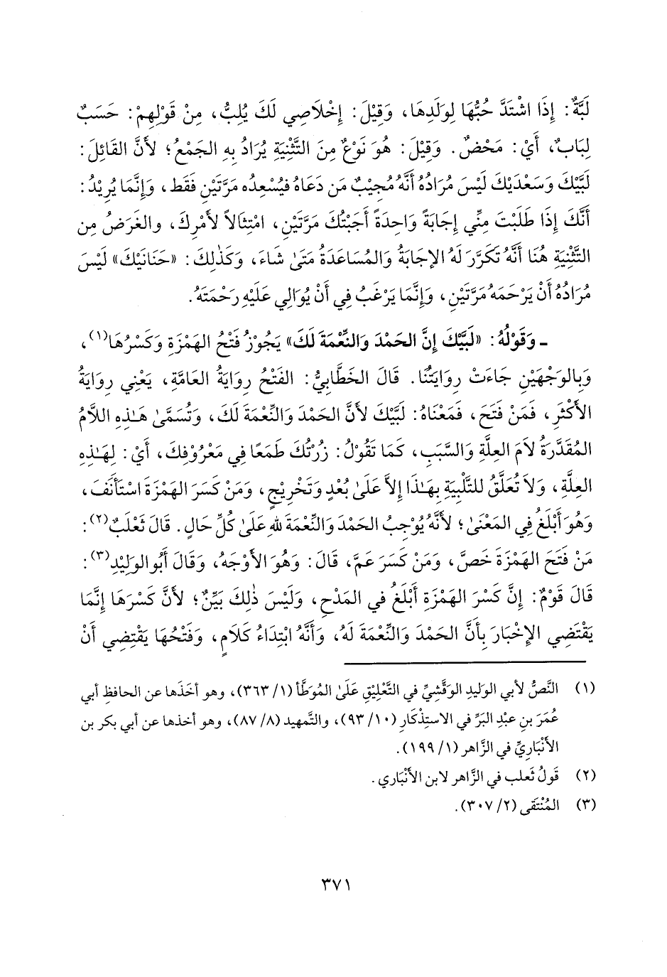لبة: إذا اشتد حبها لولدها، وقيل: إخلاصي لك يلب، من قولهم: حسب لباب، أي: محض. وقيل: هو نوع من التثنية يراد به الجمع؛ لأن القائل: لبيك وسعديك ليس مراده أنه مجيب من دعاه فيسعده مرتين فقط، وإنما يريد: أنك إذا طلبت مني إجابة واحدة أجبتك مرتين، امتثالاً لأمرك، والغرض من التثنية هنا أنه تكرر له الإجابة والمساعدة متى شاء، وكذلك: "حنانيك" ليس مراده أن يرحمه مرتين، وإنما يرغب في أن يوالي عليه رحمته.