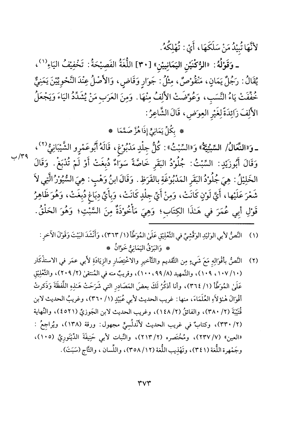 و"النعال/ 39/ب السبتية" و"السبت": كل جلد مدبوغ، قاله أبو عمرو الشيباني، وقال أبو زيد: السبت: جلود البقر خاصة سواء دبغت أو لم تدبغ. وقال الخليل: هي جلود البقر المدبوغة بالقرظ. وقال ابن وهب: هي السيور التي لا شعر عليها، أي لون كانت، ومن أي جلد كانت، وبأي دباغ دبغت، وهو ظاهر قول أبي عمر في هذا الكتاب؛ وهي مأخوذة من السبت؛ وهو الحلق.