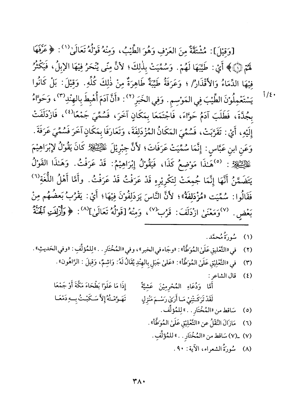 [وقيل]: مشتقة من العرف وهو الطيب، ومنه قوله تعالى: {عَرَّفَهَا لَهُمْ (6)} أي: طيبها لهم. وسميت بذلك؛ لأن منى ينحر فيها الإبل، فيكثر فيها الدماء والأقذار/ 40/أ؛ وعرفة طيبة طاهرة من ذلك كله. وقيل: بل كانوا يستعملون الطيب في الموسم. وفي الخبر: "أن آدم أهبط بالهند، وحواء بجدة، فطلب آدم حواء، فاجتمعا بمكان آخر، فسمي جمعاً، فازدلفت إليه، أي: تقربت، فسمي المكان المزدلفة، وتعارفا بمكان آخر فسمي عرفة. وعن ابن عباس: إنما سميت عرفات؛ لأن جبريل عليه السلام كان يقول لإبراهيم عليه السلام: هذا موضع كذا، فيقول إبراهيم: قد عرفت. وهذا القول يتضمن أنها إنما جمعت لتكريره قد عرفت قد عرفت. وأما أهل اللغة فقالوا: سميت "مزدلفة"؛ لأن الناس يزدلفون فيها؛ أي: يقرب بعضهم من بعض. ومعنى ازدلف: قرب، ومنه [قوله تعالى]: {وَأُزْلِفَتْ الْجَنَّةُ