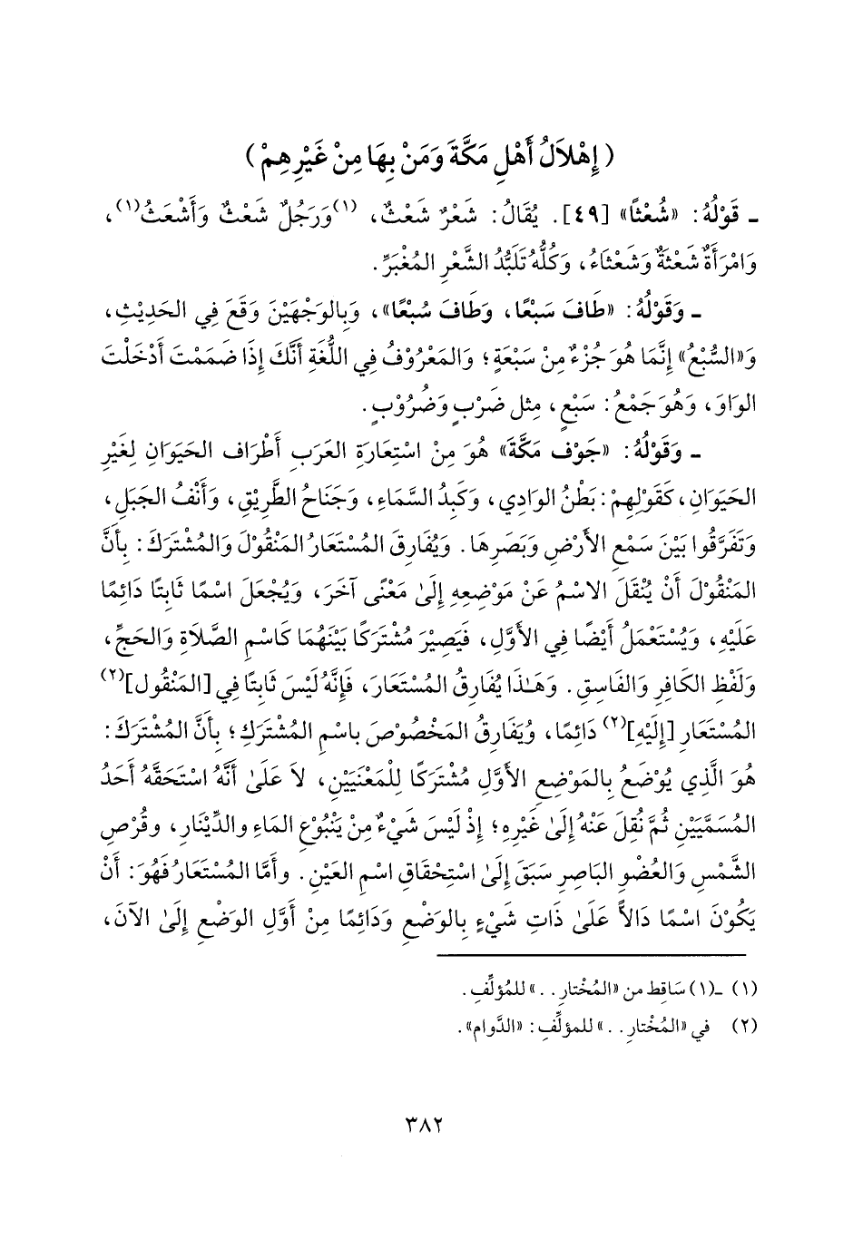 وقوله: "جوف مكة" هو من استعارة العرب أطراف الحيوان لغير الحيوان، كقولهم: بطن الوادي، وكبد السماء، وجناح الطريق، وأنف الجبل، وتفرقوا بين سمع الأرض وبصرها. ويفارق المستعار المنقول والمشترك: بأن المنقول أن ينقل الاسم عن موضعه إلى معنى آخر، ويجعل اسماً ثابتاً دائماً عليه، ويستعمل أيضاً في الأول، فيصير مشتركاً بينهما كاسم الصلاة والحج، ولفظ الكافر والفاسق. وهذا يفارق المستعار، فإنه ليس ثابتاً في [المنقول] المستعار [إليه] دائماً، ويفارق المخصوص باسم المشترك؛ بأن المشترك: هو الذي يوضع بالموضع الأول مشتركاً للمعنيين، لا على أنه استحقه أحد المسميين ثم نقل عنه إلى غيره؛ إذ ليس شيء من ينبوع الماء والدينار، وقرص الشمس والعضو الباصر سبق إلى استحقاق اسم العين. وأما المستعار فهو: أن يكون اسماً دالاً على ذات شيء بالوضع ودائماً من أول الوضع إلى الآن،