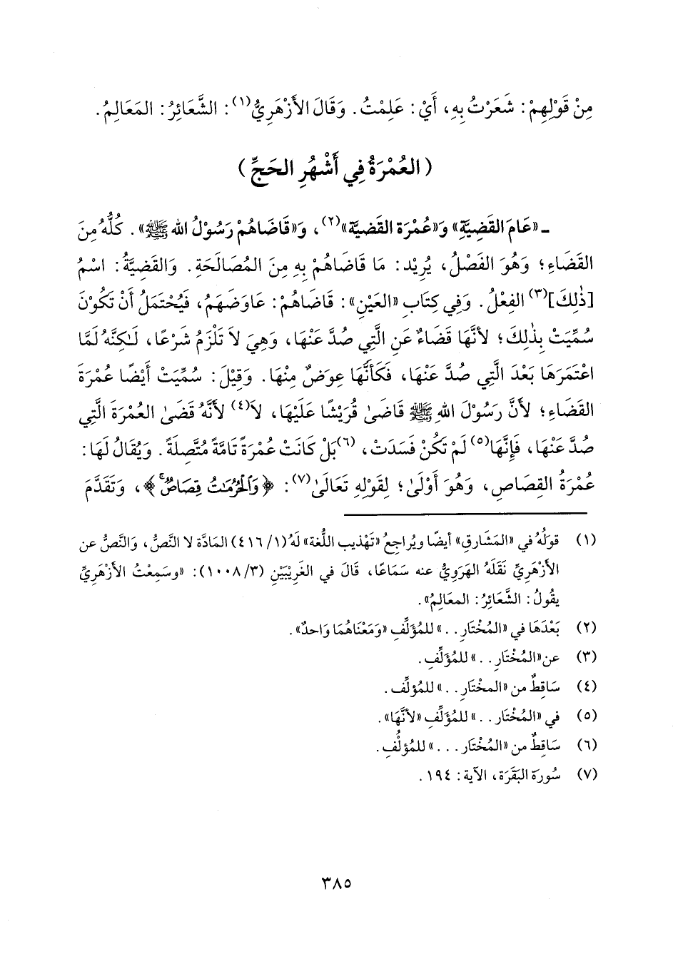 "عام القضية" و"عمرة القضية"، و"قاضاهم رسول الله صلى الله عليه وسلم". كله من القضاء؛ وهو الفصل، يريد: ما قاضاهم به من المصالحة. والقضية: اسم [ذلك] الفعل. وفي كتاب "العين": قاضاهم: عاوضهم، فيحتمل أن تكون سميت بذلك؛ لأنها قضاء عن التي صد عنها، وهي لا تلزم شرعاً، لكنه لما اعتمرها بعد التي صد عنها، فكأنها عوض منها. وقيل: سميت أيضاً عمرة القضاء؛ لأن رسول الله صلى الله عليه وسلم قاضى قريشاً عليها، لا لأنه قضى العمرة التي صد عنها، فإنها لم تكن فسدت، بل كانت عمرة تامة متصلة. ويقال لها: عمرة القصاص، وهو أولى؛ لقوله تعالى: {وَالْحُرُمَاتُ قِصَاصٌ}، وتقدم