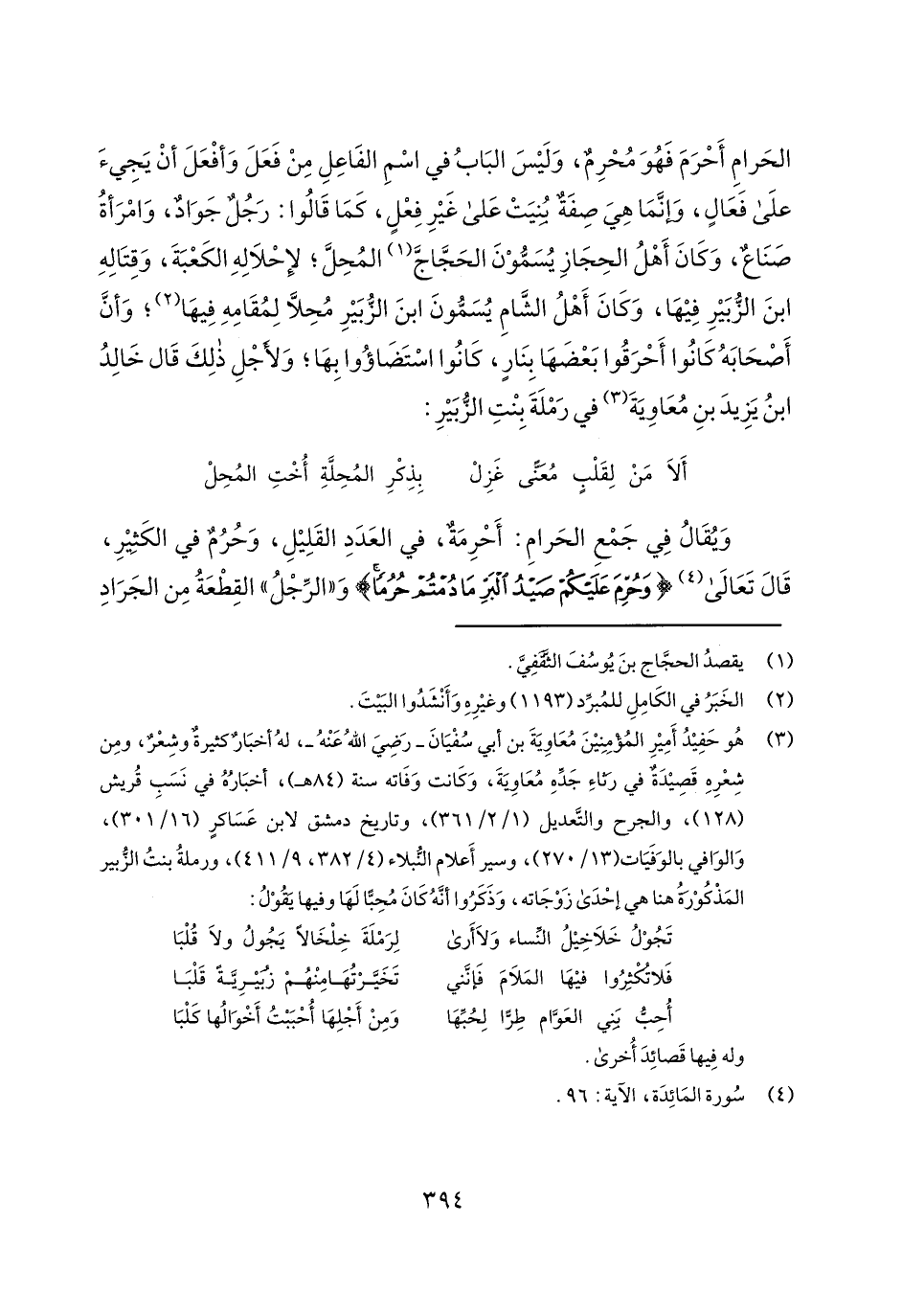 الحرام أحرم فهو محرم، وليس الباب في اسم الفاعل من فعل وأفعل أن يجيء على فعال، وإنما هي صفة بنيت على غير فعل، كما قالوا: رجل جواد، وامرأة صناع، وكان أهل الحجاز يسمون الحجاج المحل؛ لإحلاله الكعبة، وقتاله ابن الزبير فيها، وكان أهل الشام يسمون ابن الزبير محلاً لمقامه فيها؛ وأن أصحابه كانوا أحرقوا بعضها بنار، كانوا استضاؤوا بها؛ ولأجل ذلك قال خالد ابن يزيد بن معاوية في رملة بنت الزبير: