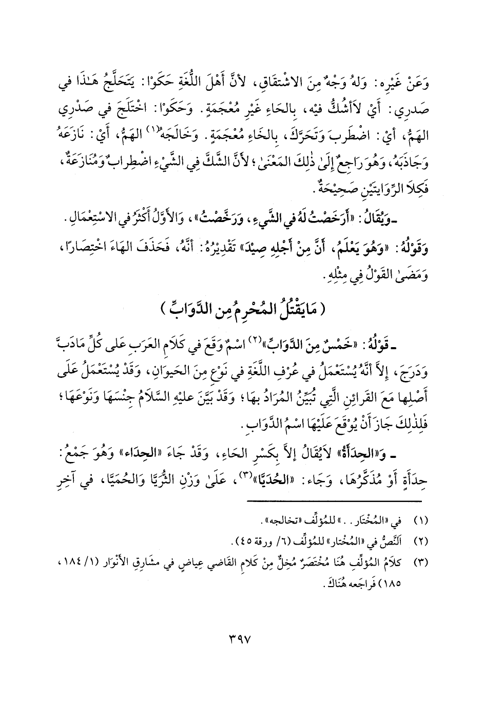 وعن غيره: وله وجه من الاشتقاق، لأن أهل اللغة حكوا: يتحلج هذا في صدري: أي لا أشك فيه، بالحاء غير معجمة. وحكوا: اختلج في صدري الهم، أي: اضطرب وتحرك، بالخاء معجمة. وخالجه الهم، أي: نازعه وجاذبه، وهو راجع إلى ذلك المعنى؛ لأن الشك في الشيء اضطراب ومنازعة، فكلا الروايتين صحيحة.