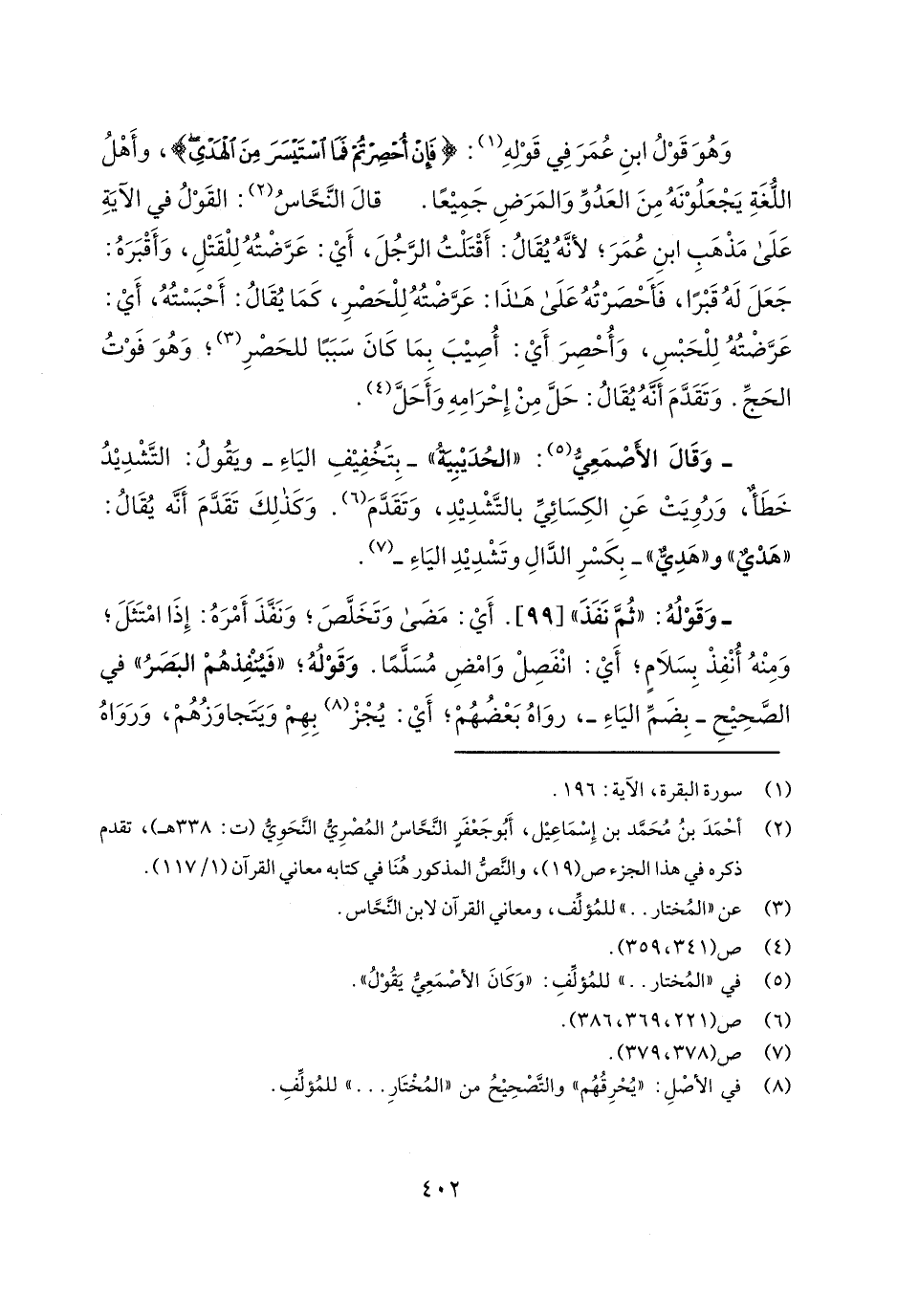 وهو قول ابن عمر في قوله: {فَإِنْ أُحْصِرْتُمْ فَمَا اسْتَيْسَرَ مِنْ الْهَدْيِ}، وأهل اللغة يجعلونه من العدو والمرض جميعاً. قال النحاس: القول في الآية على مذهب ابن عمر؛ لأنه يقال: أقتلت الرجل، أي: عرضته للقتل، وأقبره: جعل له قبراً، فأحصرته على هذا: عرضته للحصر، كما يقال: أحبسته، أي: عرضته للحبس، وأحصر أي: أصيب بما كان سبباً للحصر؛ وهو فوت الحج. وتقدم أنه يقال: حل من إحرامه وأحل.