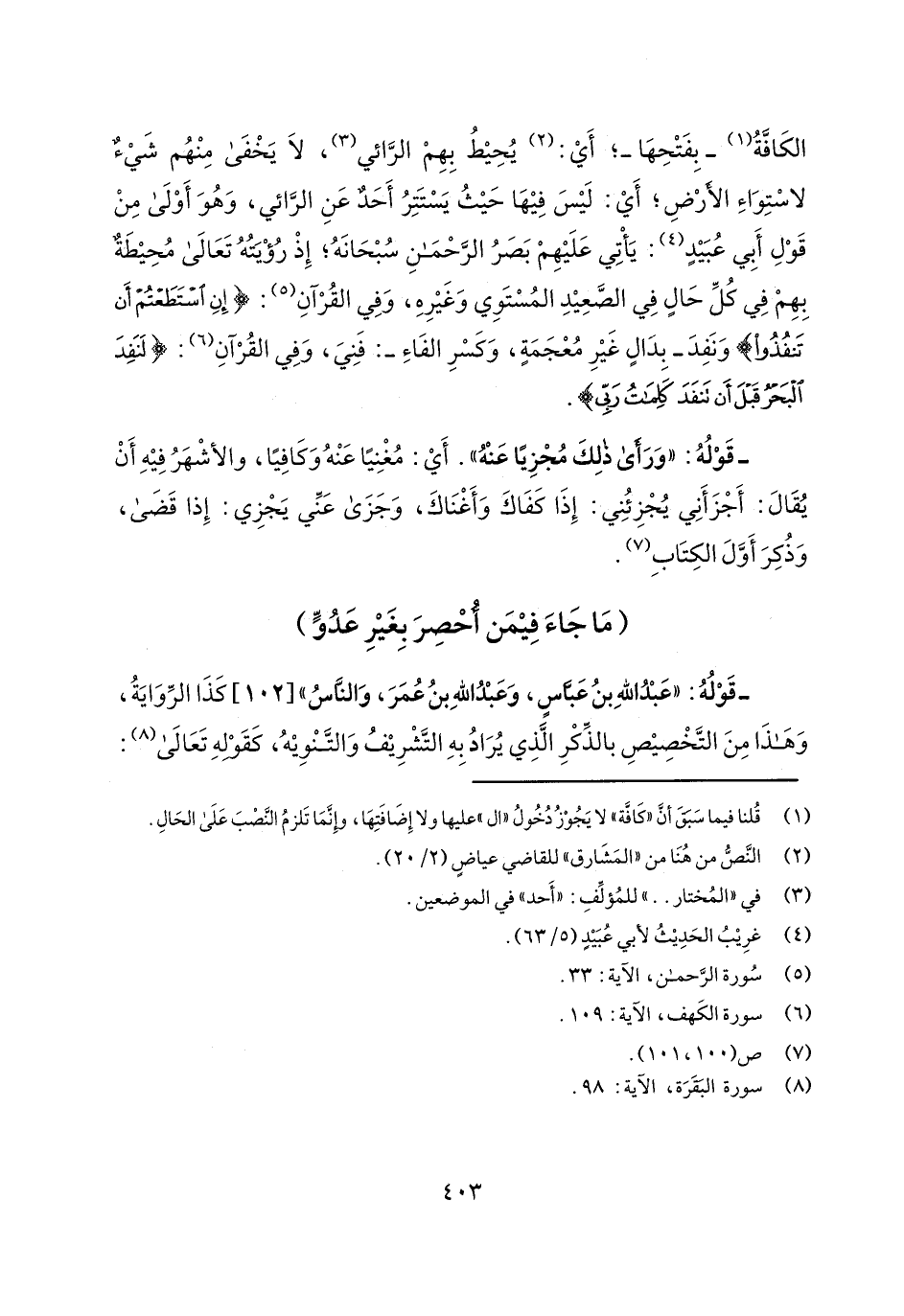 الكافة- بفتحها-؛ أي: يحيط بهم الرائي، لا يخفى منهم شيء لاستواء الأرض؛ أي: ليس فيها حيث يستتر أحد عن الرائي، وهو أولى من قول أبي عبيد: يأتي عليهم بصر الرحمن سبحانه؛ إذ رؤيته تعالى محيطة بهم في كل حال في الصعيد المستوي وغيره، وفي القرآن: {إِنْ اسْتَطَعْتُمْ أَنْ تَنفُذُوا} ونفد- بدال غير معجمة، وكسر الفاء-: فني، وفي القرآن: {لَنَفِدَ الْبَحْرُ قَبْلَ أَنْ تَنفَدَ كَلِمَاتُ رَبِّي}.