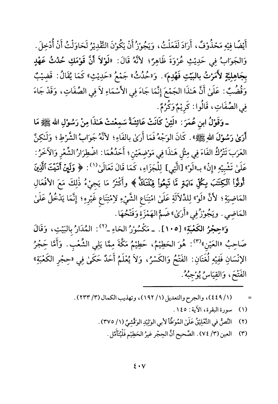 و"حجر الكعبة" [105].- مكسور الحاء-: المدار بالبيت، وقال صاحب "العين": هو الحطيم، حطيم مكة مما يلي الشعب. وأما حجر الإنسان ففيه لغتان: الفتح والكسر، ولا يعلم أحد حكى في "حجر الكعبة" الفتح، والقياس يوجبه.