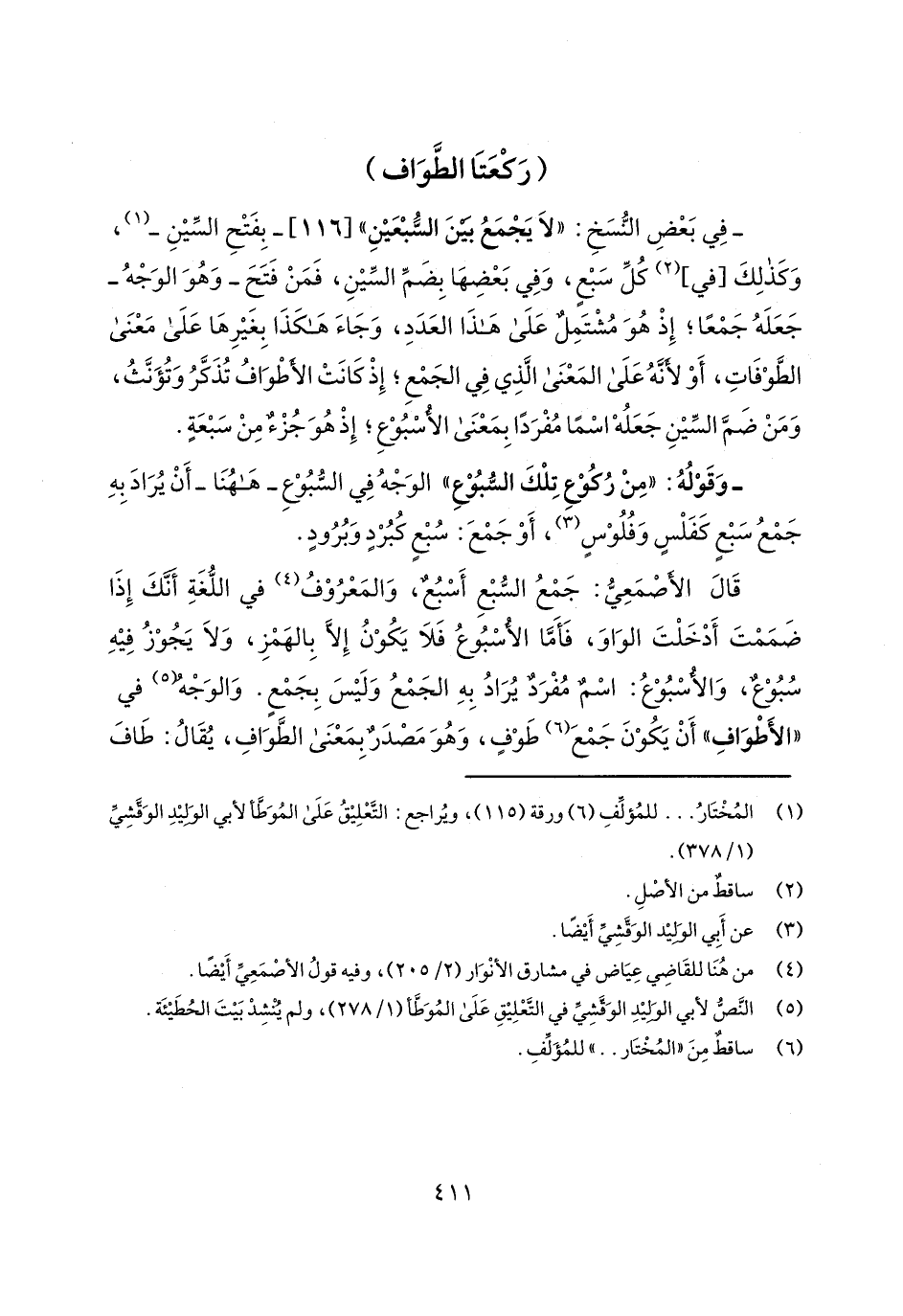 في بعض النسخ: "لا يجمع بين السبعين" [116]- بفتح السين-، وكذلك [في] كل سبع، وفي بعضها بضم السين، فمن فتح- وهو الوجه- جعله جمعاً؛ إذ هو مشتمل على هذا العدد، وجاء هكذا بغيرها على معنى الطوفات، أو لأنه على المعنى الذي في الجمع؛ إذ كانت الأطواف تذكر وتؤنث، ومن ضم السين جعله اسماً مفرداً بمعنى الأسبوع؛ إذ هو جزء من سبعة.