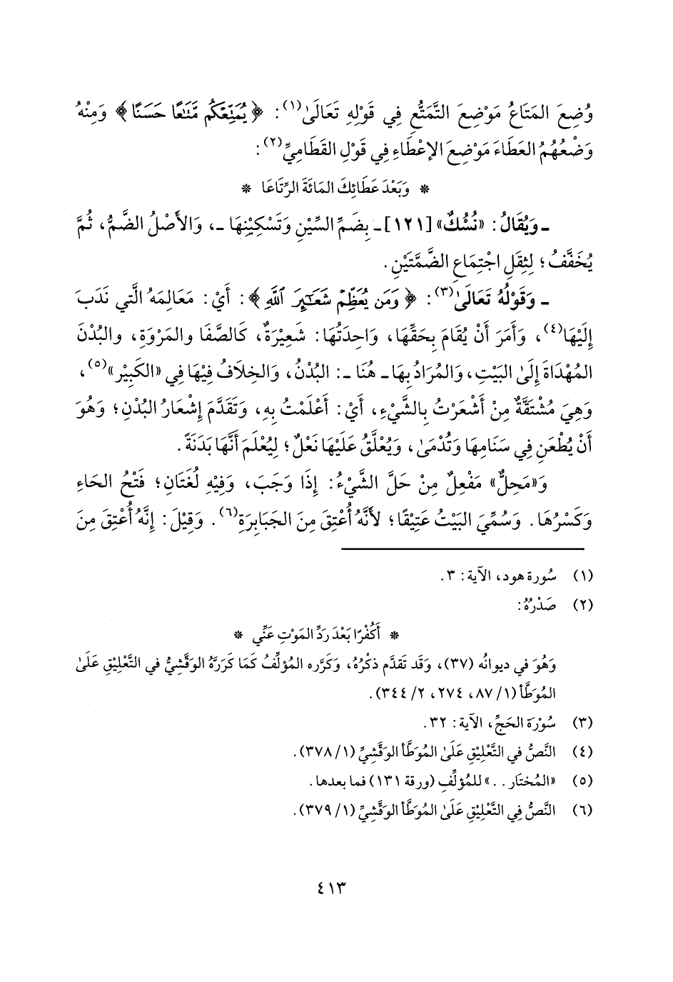 وضع المتاع موضع التمتع في قوله تعالى: {يُمَتِّعْكُمْ مَتَاعاً حَسَناً} ومنه وضعهم العطاء موضع الإعطاء في قول القطامي: