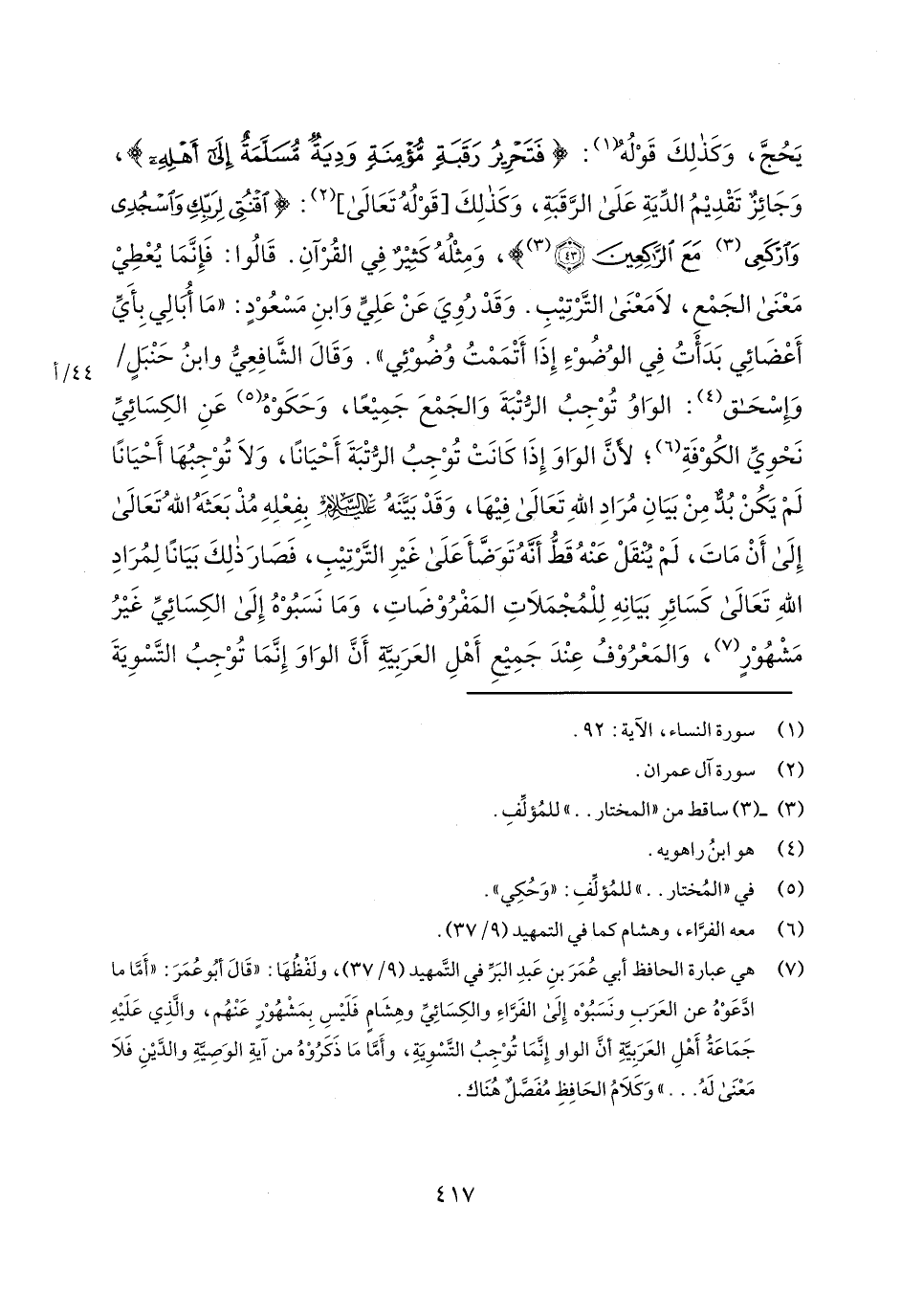 يحج، وكذلك قوله: {فَتَحْرِيرُ رَقَبَةٍ مُؤْمِنَةٍ وَدِيَةٌ مُسَلَّمَةٌ إِلَى أَهْلِهِ}، وجائز تقديم الدية على الرقبة، وكذلك [قوله تعالى]: {اقْنُتِي لِرَبِّكِ وَاسْجُدِي وَارْكَعِي مَعَ الرَّاكِعِينَ (43)}، ومثله كثير في القرآن. قالوا: فإنما يعطي معنى الجمع، لا معنى الترتيب. وقد روي عن علي وابن مسعود: "ما أبالي بأي أعضائي بدأت في الوضوء إذا أتممت وضوئي". وقال الشافعي وابن حنبل/ 44/أوإسحق: الواو توجب الرتبة والجمع جميعاً، وحكوه عن الكسائي نحوي الكوفة؛ لأن الواو إذا كانت توجب الرتبة أحياناً، ولا توجبها أحياناً لم يكن بد من بيان مراد الله تعالى فيها، وقد بينه عليه السلام بفعله مذ بعثه الله تعالى إلى أن مات، لم ينقل عنه قط أنه توضأ على غير الترتيب، فصار ذلك بياناً لمراد الله تعالى كسائر بيانه للمجملات المفروضات، وما نسبوه إلى الكسائي غير مشهور، والمعروف عند جميع أهل العربية أن الواو إنما توجب التسوية