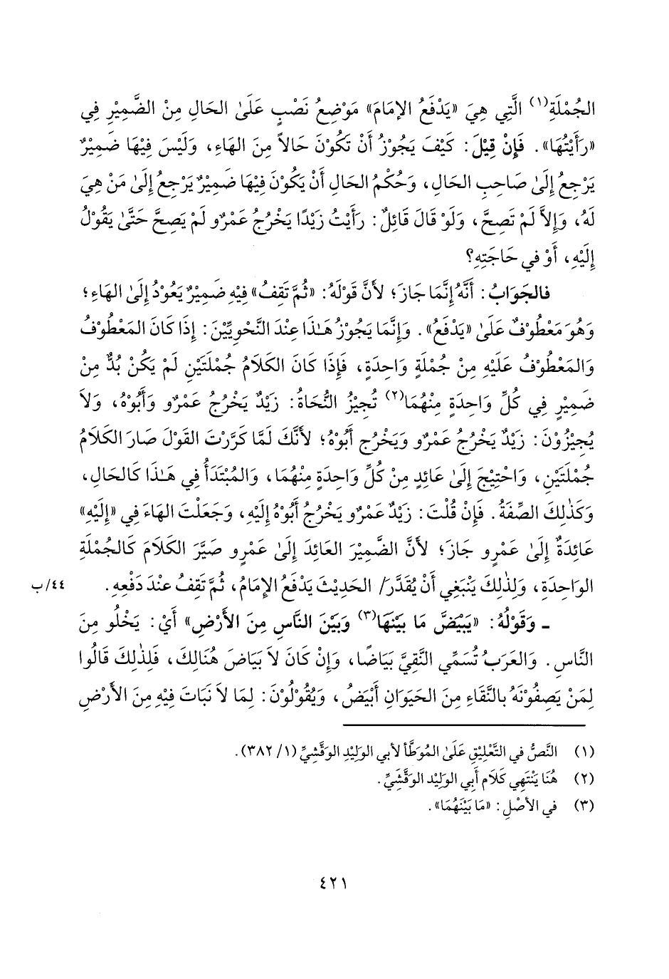 فالجواب: أنه إنما جاز؛ لأن قوله: "ثم تقف" فيه ضمير يعود إلى الهاء؛ وهو معطوف على "يدفع". وإنما يجوز هذا عند النحويين: إذا كان المعطوف والمعطوف عليه من جملة واحدة، فإذا كان الكلام جملتين لم يكن بد من ضمير في كل واحدة منهما تجيز النحاة: زيد يخرج عمرو وأبوه، ولا يجيزون: زيد يخرج عمرو ويخرج أبوه؛ لأنك لما كررت القول صار الكلام جملتين، واحتيج إلى عائد من كل واحدة منهما، والمبتدأ في هذا كالحال، وكذلك الصفة. فإن قلت: زيد عمرو يخرج أبوه إليه، وجعلت الهاء في "إليه" عائدة إلى عمرو جاز؛ لأن الضمير العائد إلى عمرو صير الكلام كالجملة الواحدة، ولذلك ينبغي أن يقدر/ 44/ب الحديث يدفع الإمام، ثم تقف عند دفعه.