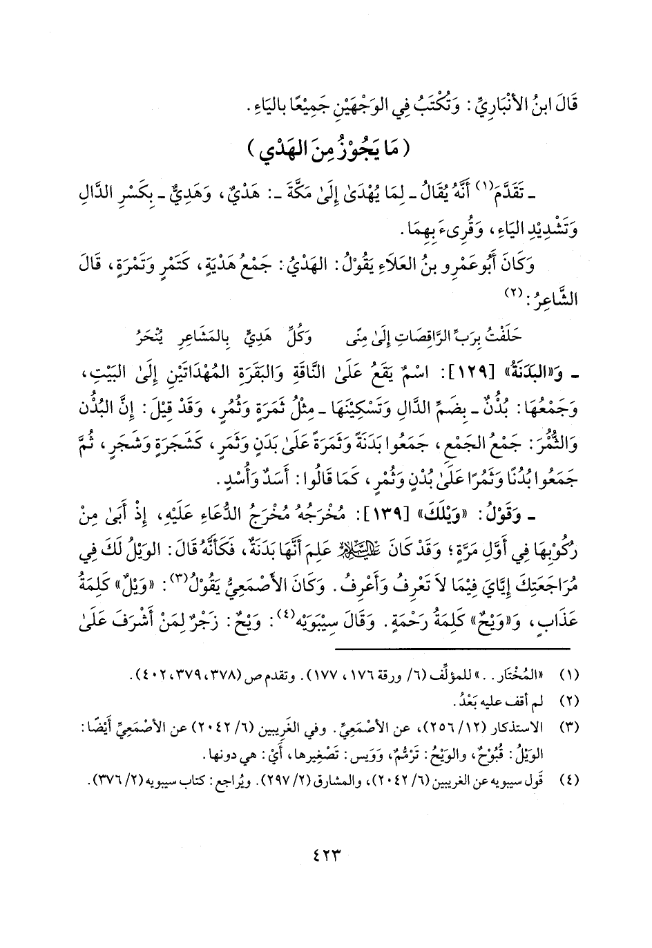 و"البدنة" [129]: اسم يقع على الناقة والبقرة المهداتين إلى البيت، وجمعها: بدن- بضم الدال وتسكينها- مثل ثمرة وثمر، وقد قيل: إن البدن والثمر: جمع الجمع، جمعوا بدنة وثمرة على بدن وثمر، كشجرة وشجر، ثم جمعوا بدناً وثمراً على بدن وثمر، كما قالوا: أسد وأسد.
