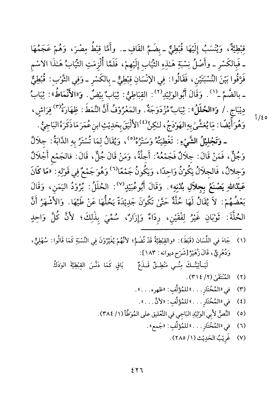 قبطية، وينسب إليها قبطي- بضم القاف-. وأما قبط مصر، وهم عجمها- فبالكسر- وأصل نسبة هذه الثياب إليهم، فلما ألزمت الثياب هذا الاسم فرقوا بين النسبتين، فقالوا: في الإنسان قبطي- بالكسر- وفي الثوب: قبطي- بالضم-. وقال أبو الوليد: القباطي: ثياب بيض. و"الأنماط": ثياب ديباج./45/أو"الحلل": ثياب مزدوجة. والمعروف أن النمط: ظهارة فراش، وهو أيضاً: ما يغشى به الهودج، لكن الأليق بحديث ابن عمر ما ذكره الباجي.