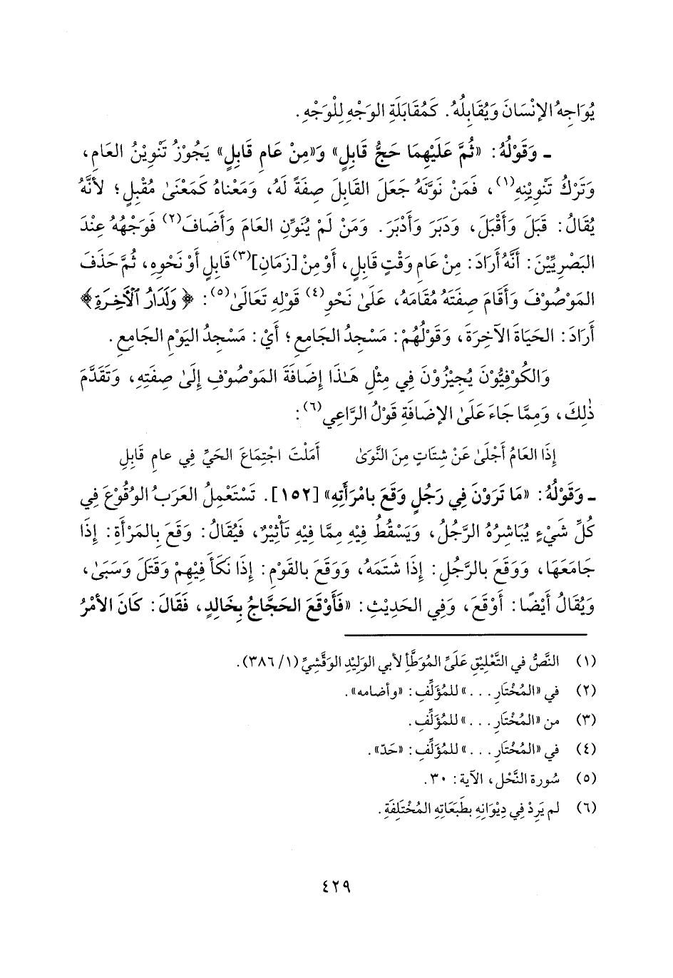 وقوله: "ثم عليهما حج قابل" و"من عام قابل" يجوز تنوين العام، وترك تنوينه، فمن نونه جعل القابل صفة له، ومعناه كمعنى مقبل؛ لأنه يقال: قبل وأقبل، ودبر وأدبر. ومن لم ينون العام وأضاف فوجهه عند البصريين: أنه أراد: من عام وقت قابل، أو من [زمان] قابل أو نحوه، ثم حذف الموصوف وأقام صفته مقامه، على نحو قوله تعالى: {وَلَدَارُ الآخِرَةِ} أراد: الحياة الآخرة، وقولهم: مسجد الجامع؛ أي: مسجد اليوم الجامع.