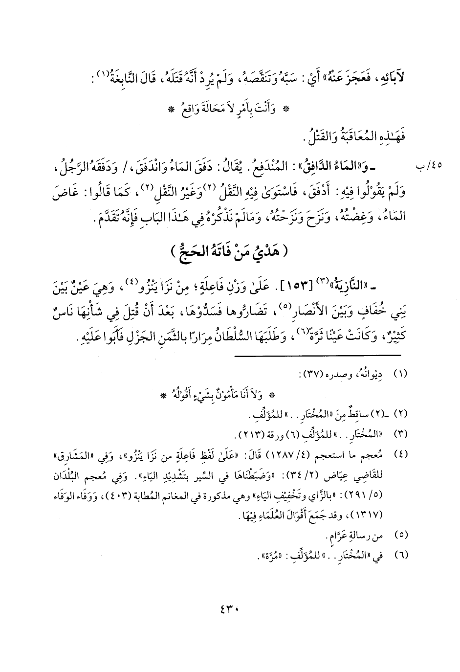 و"الماء الدافق": المندفع. يقال: دفق الماء واندفق،/45/ب ودفقه الرجل، ولم يقولوا فيه: أدفق، فاستوى فيه النقل وغير النقل، كما قالوا: غاض الماء، وغضته، ونزح ونزحته، وما لم نذكره في هذا الباب فإنه تقدم.